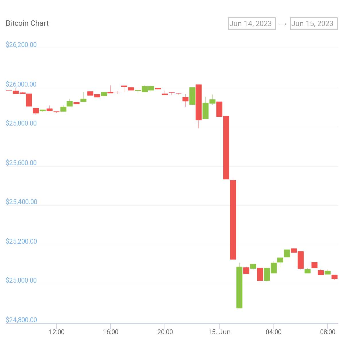في وقت باكر من صباح اليوم، 15 يونيو، اخترق سعر بيتكوين أسفل خط 25 ألف دولار لأول مرة في آخر 90 يومًا. حيث انخفض السعر بأكثر من 4 ٪ من 25965 دولارًا إلى 24879 دولارًا وفقًا لبيانات كوين جيكو.