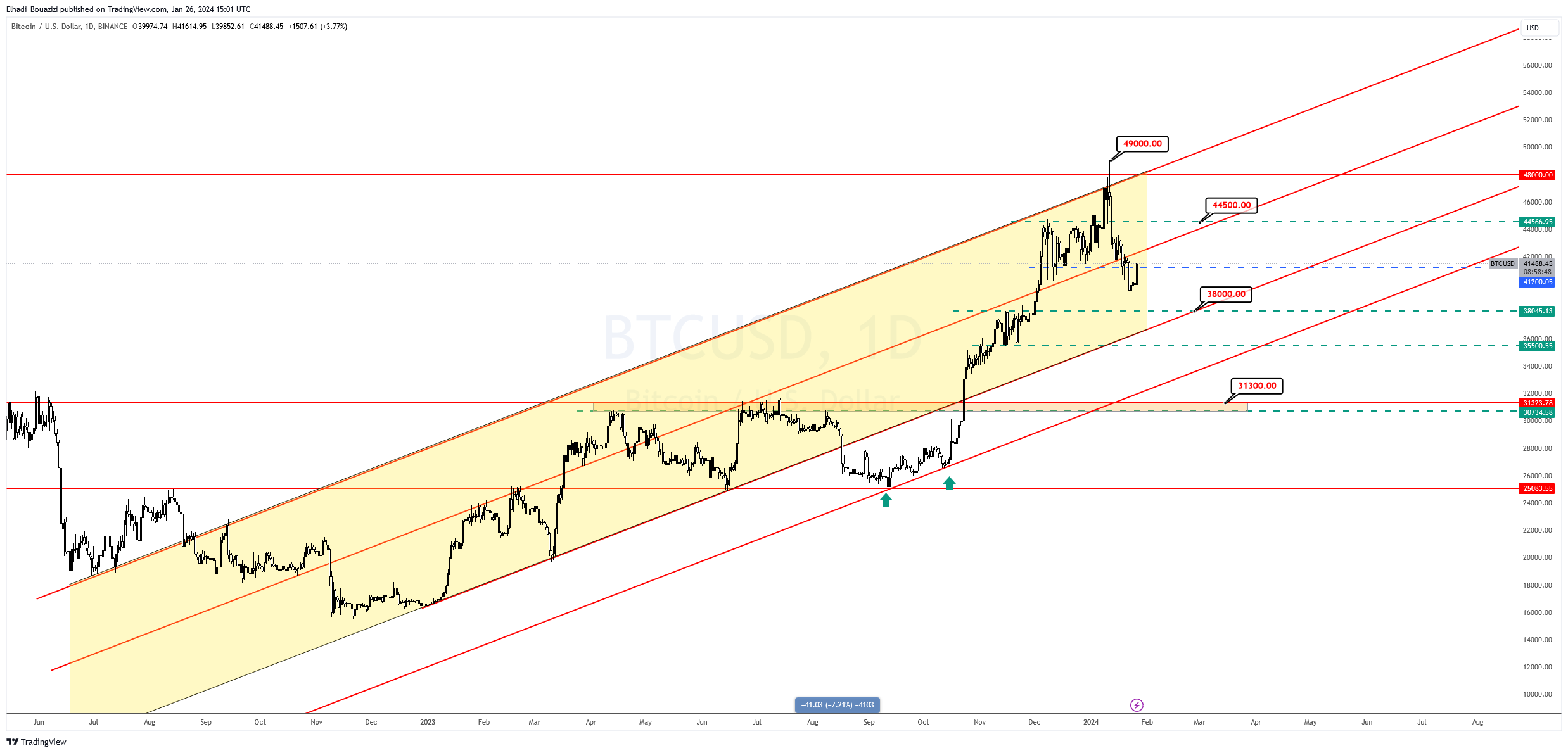 سعر البيتكوين BTC . يتحرك داخل شبكة في من القنوات السعرية الصاعدة منذ شهر سبتمبر من العام 2022. و حاليا يتداول عند سعر 41,600 دولار.
