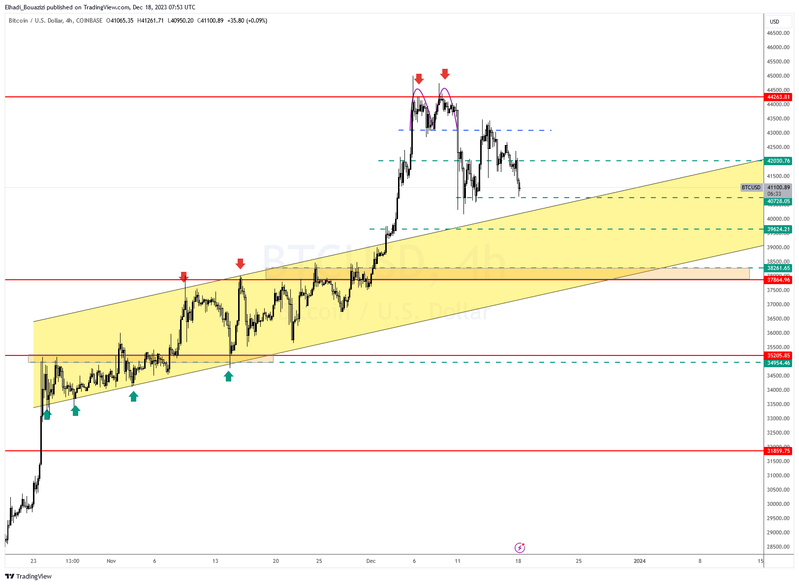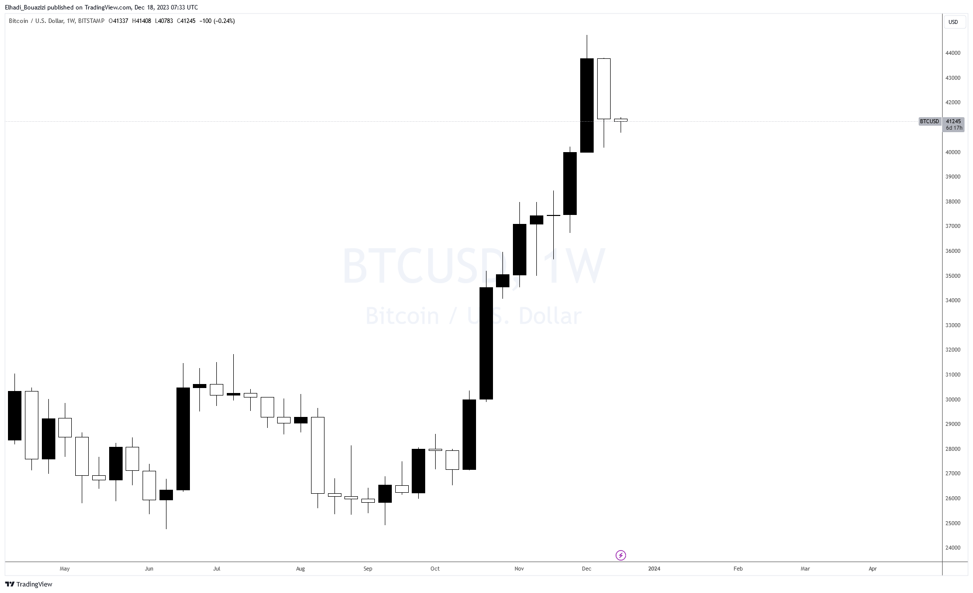 لأول مرة منذ ثمانية أسابيع الشمعة الأسبوعية لسعر البيتكوين بدولار تُغلق على انخفاض. وذلك رغم تلميح البنك الاحتياطي الفيديرالي الأمريكي أنه يخطط للبدء في تخفيض أسعار الفائدة في العام المقبل 2024. وهذا ربما يشير على قوة زخم التصحيح الهابط على المدى القريب.