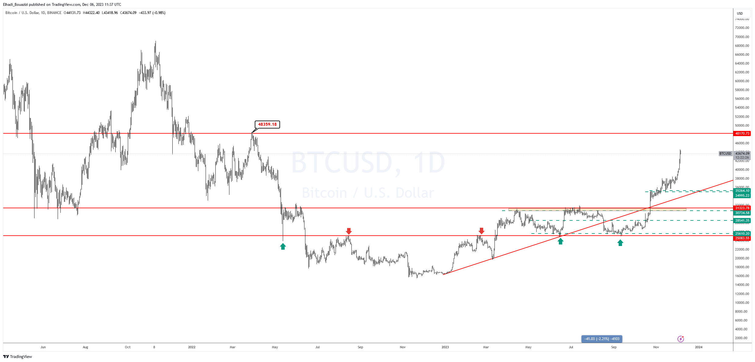 و أضاف : " عموما الاتجاه العام لسعر بيتكوين BTC واضح أنه إلى أعلى. مع هدف أولي حوالي 48,000 دولار ودعم قرب 38,000 دولار".