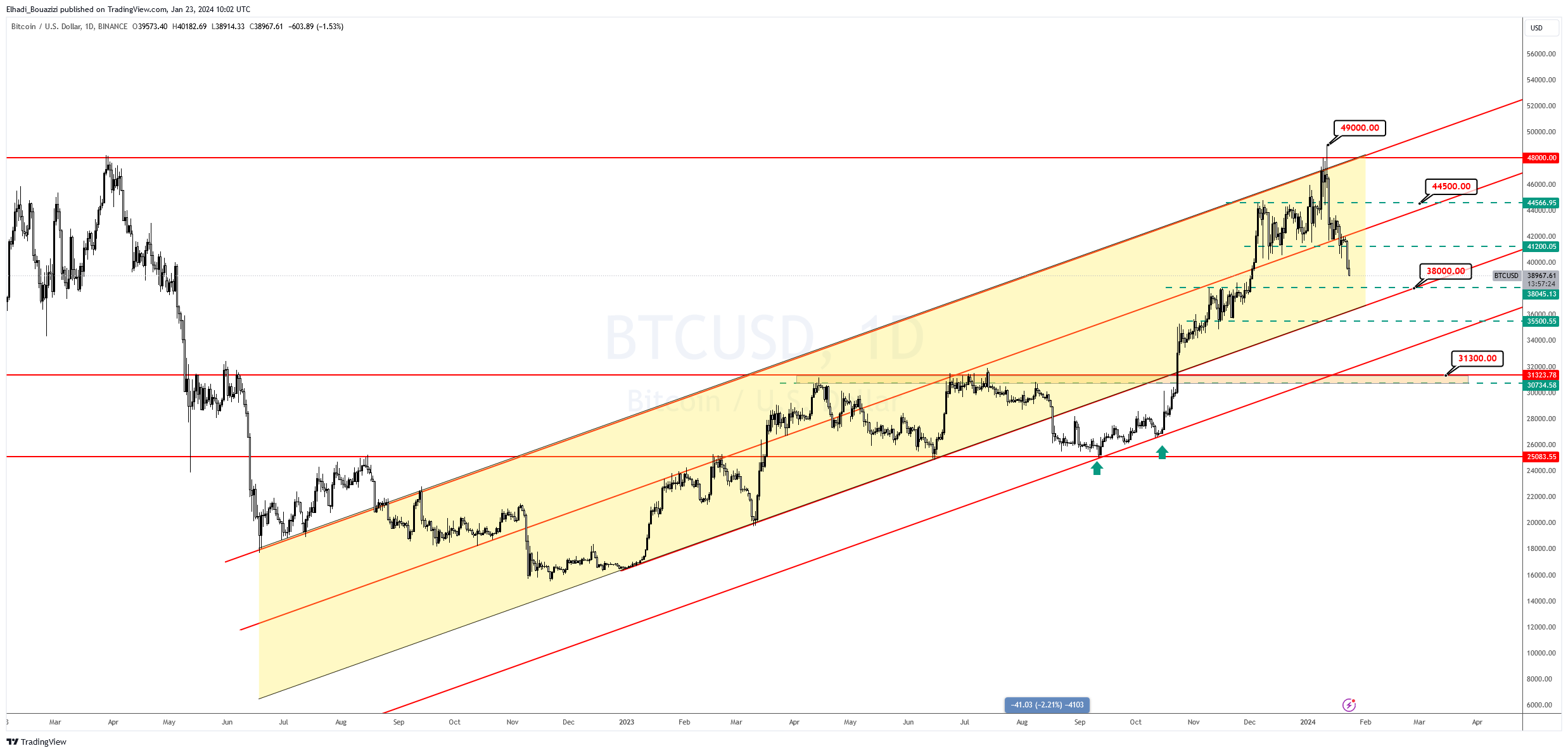 وقلنا أنه في حال تمكن سعر بيتكوين BTC من كسر مستوى الدعم 41,200 دولار. فإن الهدف التالي سوف يكون مستوى الدعم 38,000 دولار.