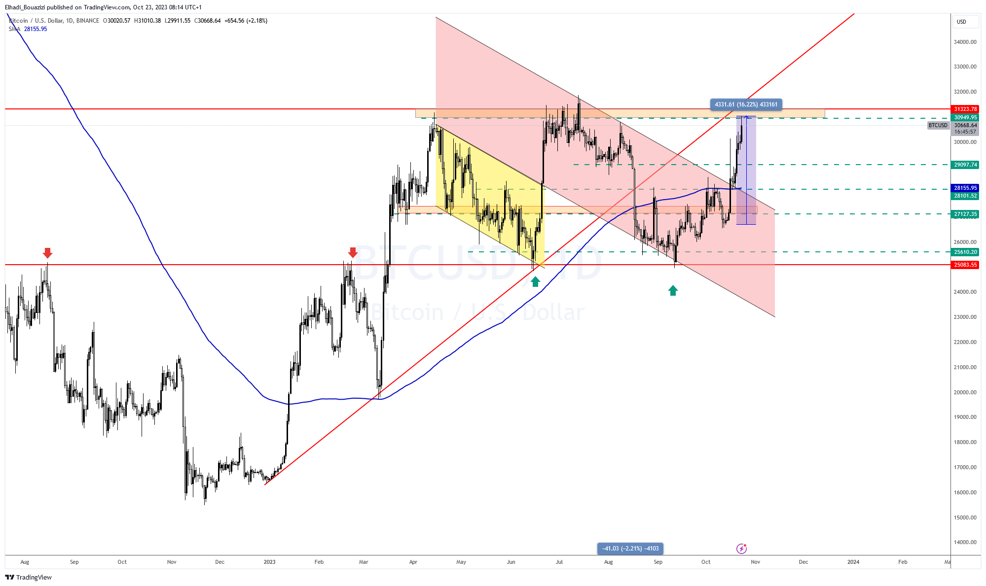 سعر البيتكوين BTC يتداول الآن عند سعر 30600 دولار. مباشرة تحت مستوى منطقة المقاومة المحصورة بين 30100 – 31300 دولار.