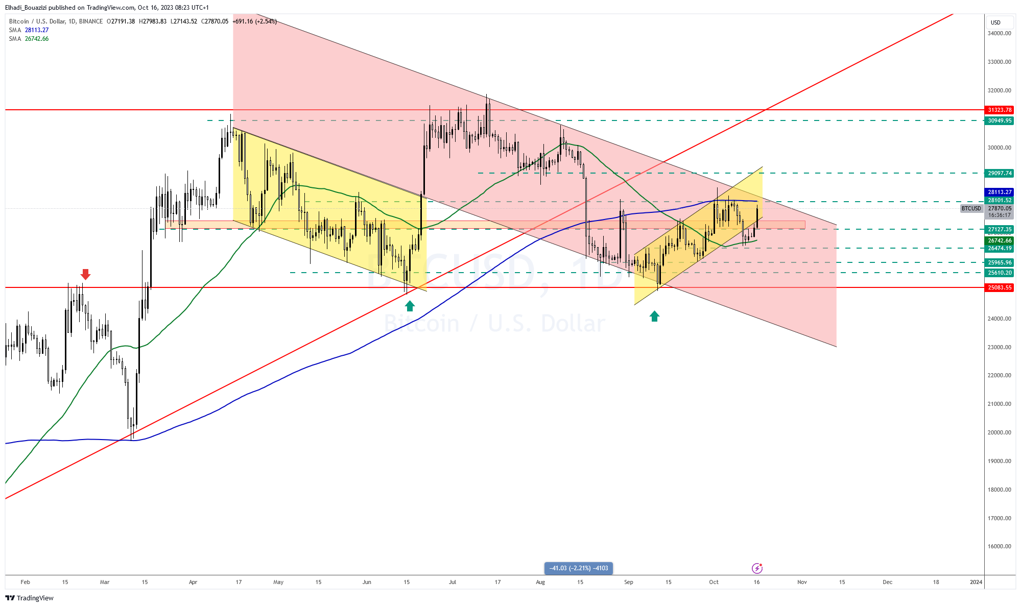 ولكن، مع موجة الارتفاع الأخيرة عاد سعر البيتكوين لتداول داخل هذه القناة الصاعدة. و هو الآن يقترب من حاجز المقاومة القوي عند سعر 28100 دولار.
