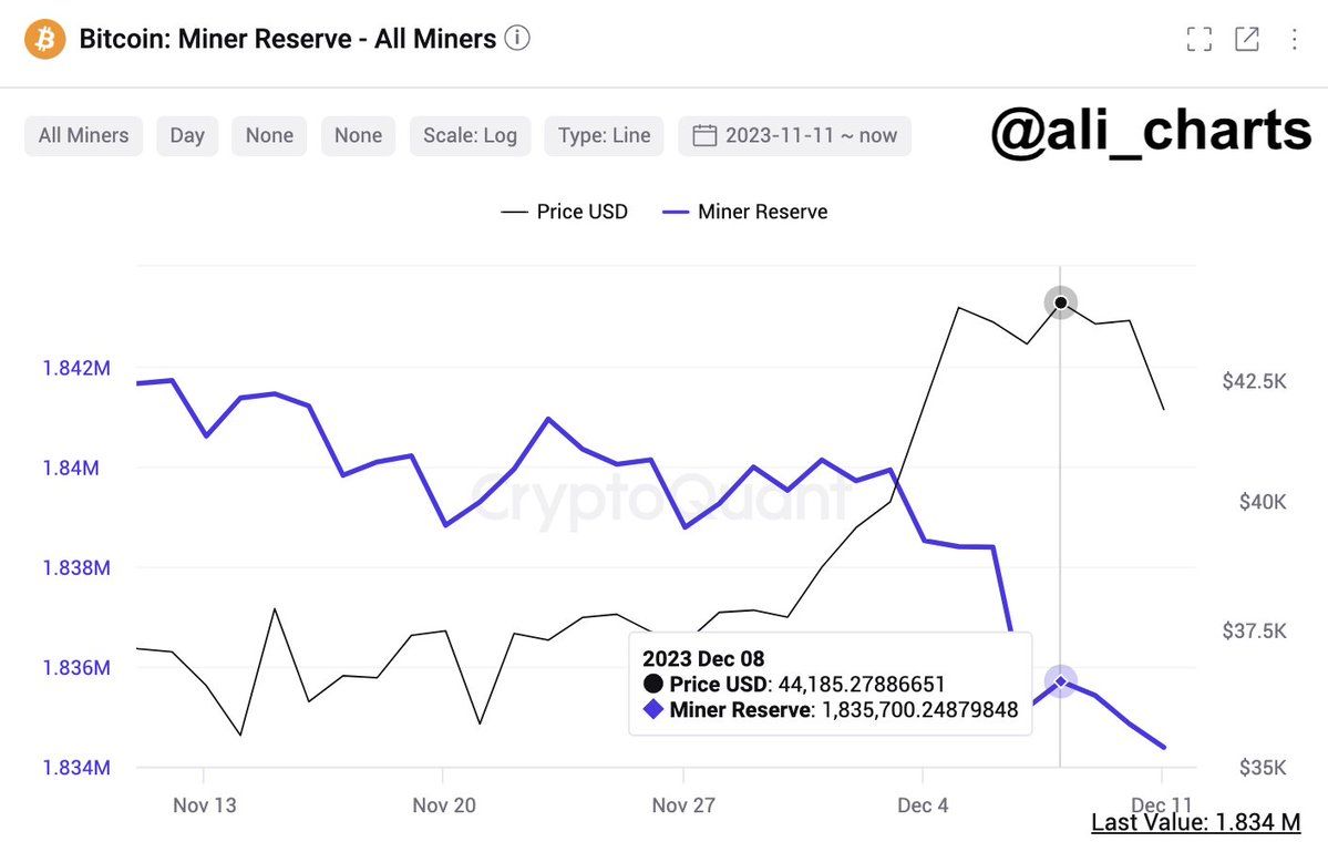 بعض المحللّين أشار إلى أن المعدّنين زادوا من وتيرة بيعهم للعملات البيتكوين. مع 1000 BTC إضافية منذ يوم الجمعة الماضية. كما أشار لذلك المحلل علي Ali في منشور على تويتر  X، مع انخفاض مؤشر "احتياطي المعدّنين Miner Reserves " للبيتكوين.