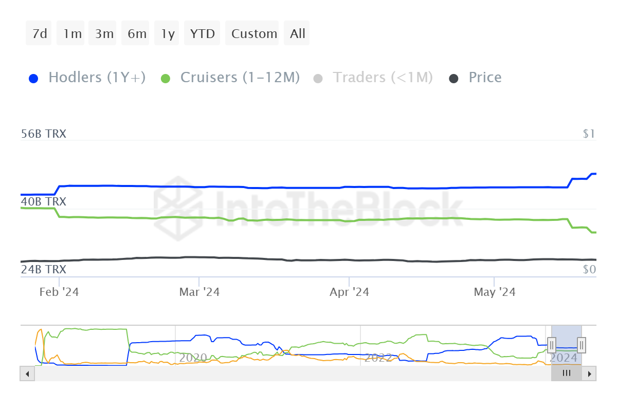 يمكن إنقاذ سعر ترون (TRX) من التوقعات الهبوطية بمساعدة مستثمريها. يواصل حاملو TRX إظهار ثقتهم في الأصل حيث يمتنعون عن بيع أي من ممتلكاتهم. وقد أدى ذلك إلى انتقال حوالي 4٪ من العرض المتداول ، والذي يمثل ما يقرب من 3.1 مليار TRX، إلى محافظ أصحاب الأسهم طويلة الأجل (LTHS).