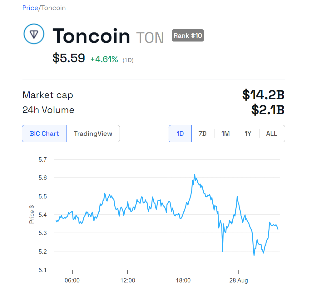 شهدت تونكوين (TON) زيادة كبيرة في السعر، حيث ارتفعت بأكثر من 8% بعد إطلاق سراح الرئيس التنفيذي لتليجرام، بافل دوروف، الذي تم اتهامه مؤخرًا من قبل السلطات الفرنسية.