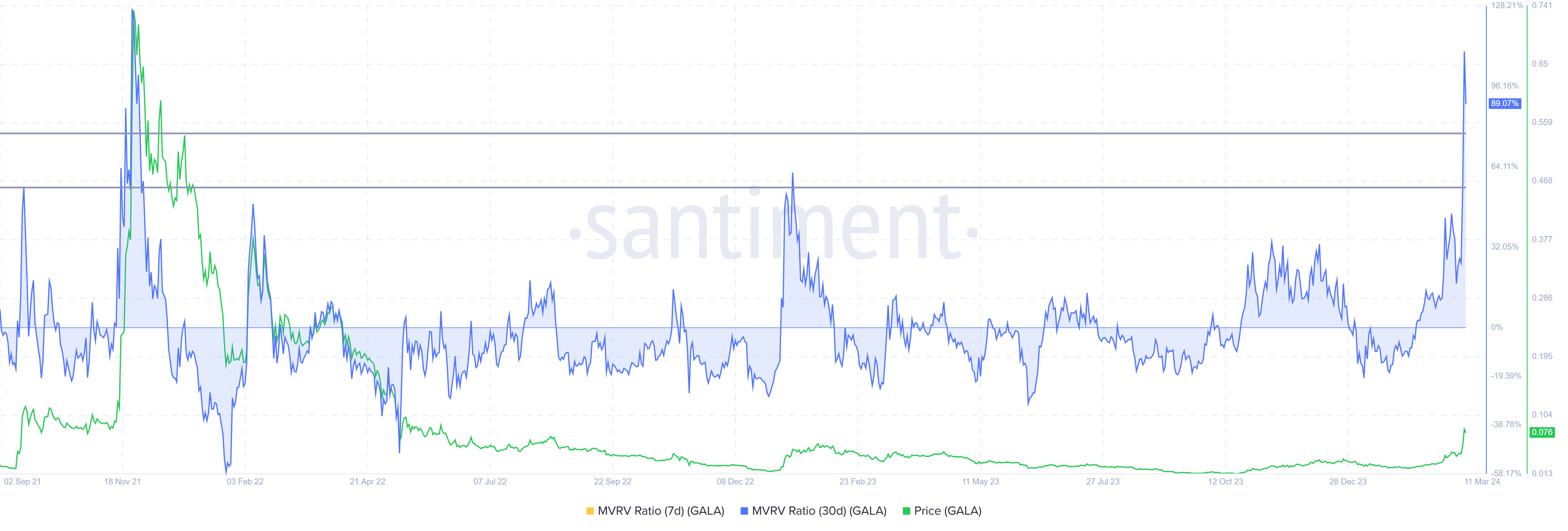 تُظهر الأنماط التاريخية أنه عندما ترتفع نسبة MVRV إلى أعلى من 34%، غالبًا ما تحدث تصحيحات كبيرة، مما يؤدي إلى مصطلح "منطقة الخطر" لهذه المنطقة. وبما أن Gala أعلى بكثير من هذه العتبة، فإن احتمالية جني الأرباح أعلى بكثير.