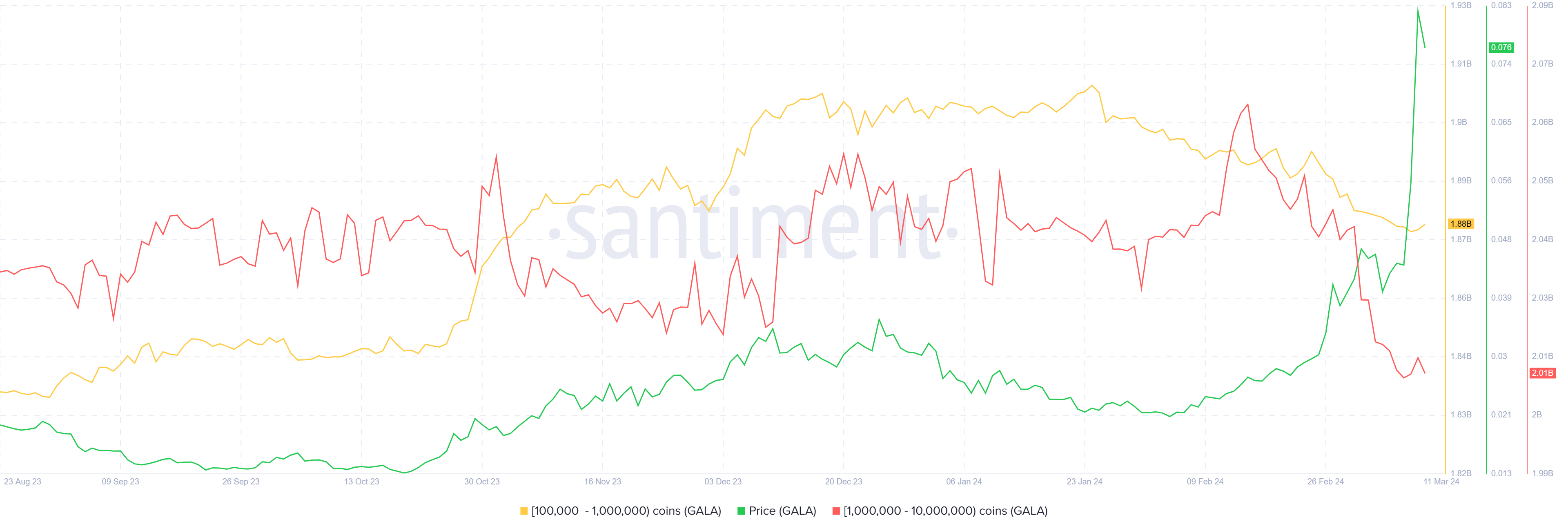 فقد باعت العناوين التي تحتفظ بما يتراوح بين 100 ألف إلى 10 ملايين GALA أكثر من 30 مليون GALA في غضون عشرة أيام. تتركز معظم عمليات البيع هذه في الوقت الذي بدأ فيه سعر جالا (GALA) في الارتفاع، مما يجعل المزيد من الارتفاعات حدثًا مطلقًا للبيع.