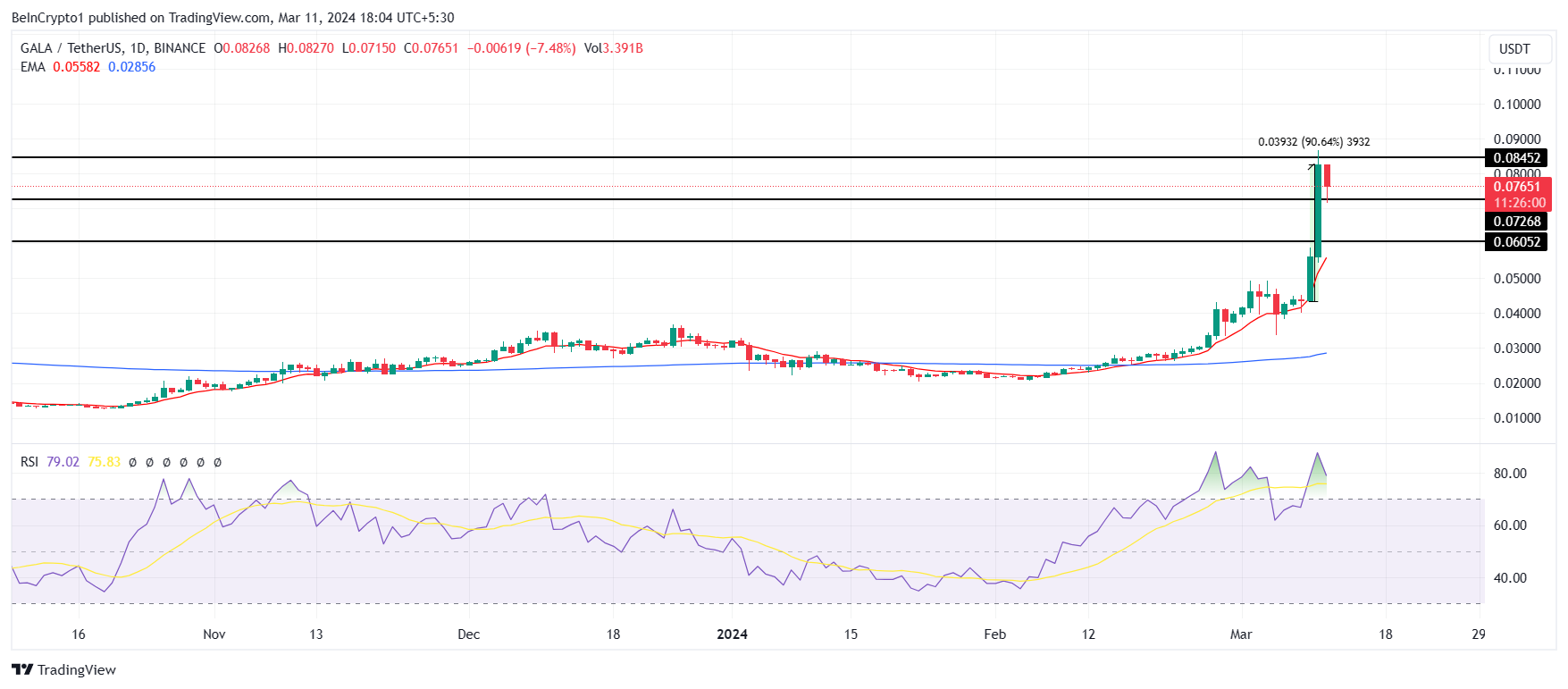 سعر الجالا (GALA) لديه فرصة جيدة للتصحيح. وتظهر العلامات بالفعل في شكل شموع حمراء، والتي تظهر على الإطار الزمني اليومي. إذا استمرت عمليات البيع على أيدي الحيتان، فمن المحتمل أن يؤدي التراجع إلى 0.06 دولار إلى محو جزء كبير من المكاسب الأخيرة.