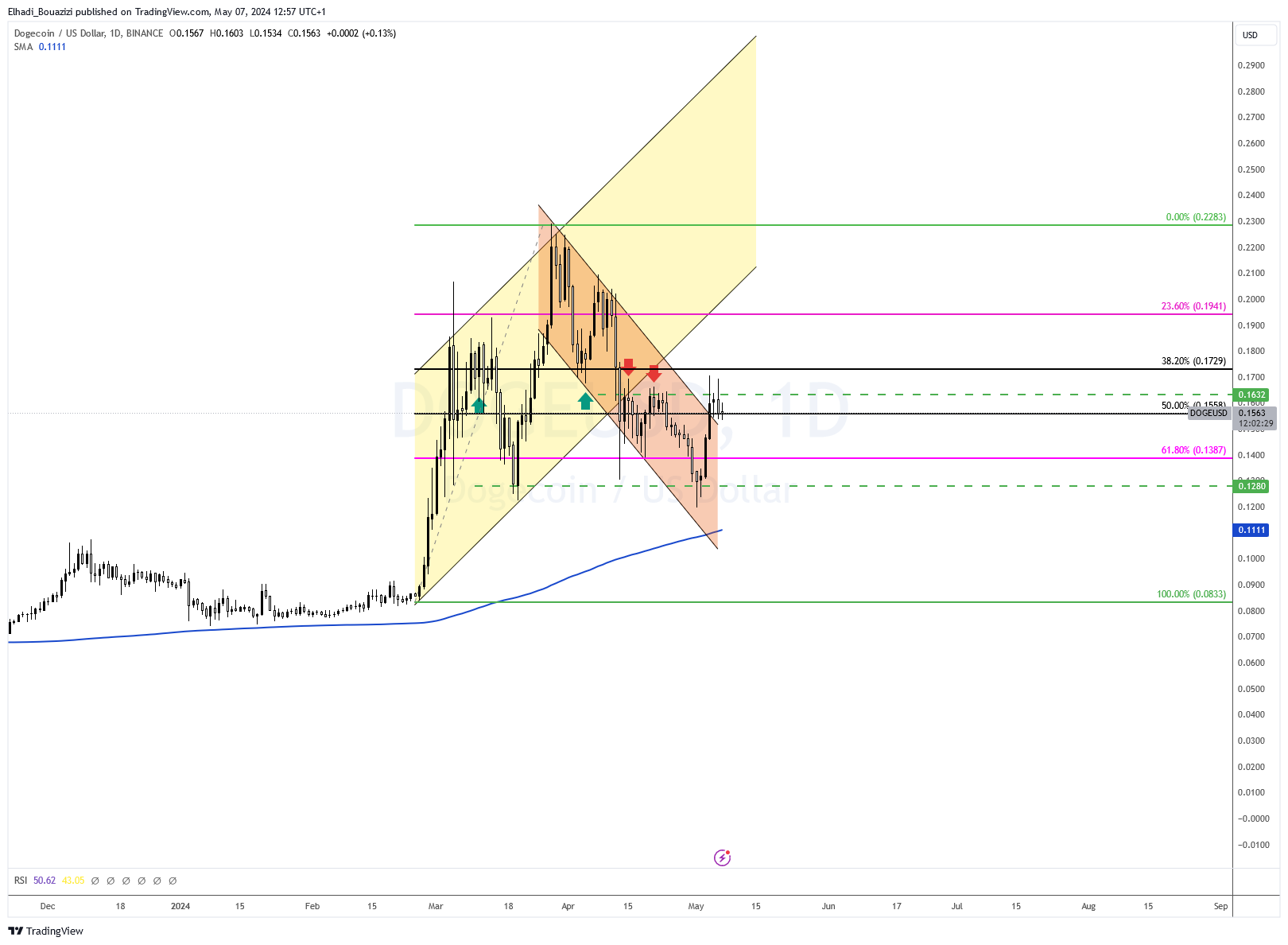على الرسم البياني الفني نلاحظ أن سعر دوجكوين DOGE قد كسر الحد العلوي للقناة السعرية الهابطة. التي كان يترحك فيها خلال الأسابيع الماضية و منذ نهاية شهر مارس عندما بلغ أعلى مستوياته منذ نوفمبر عام 2021.