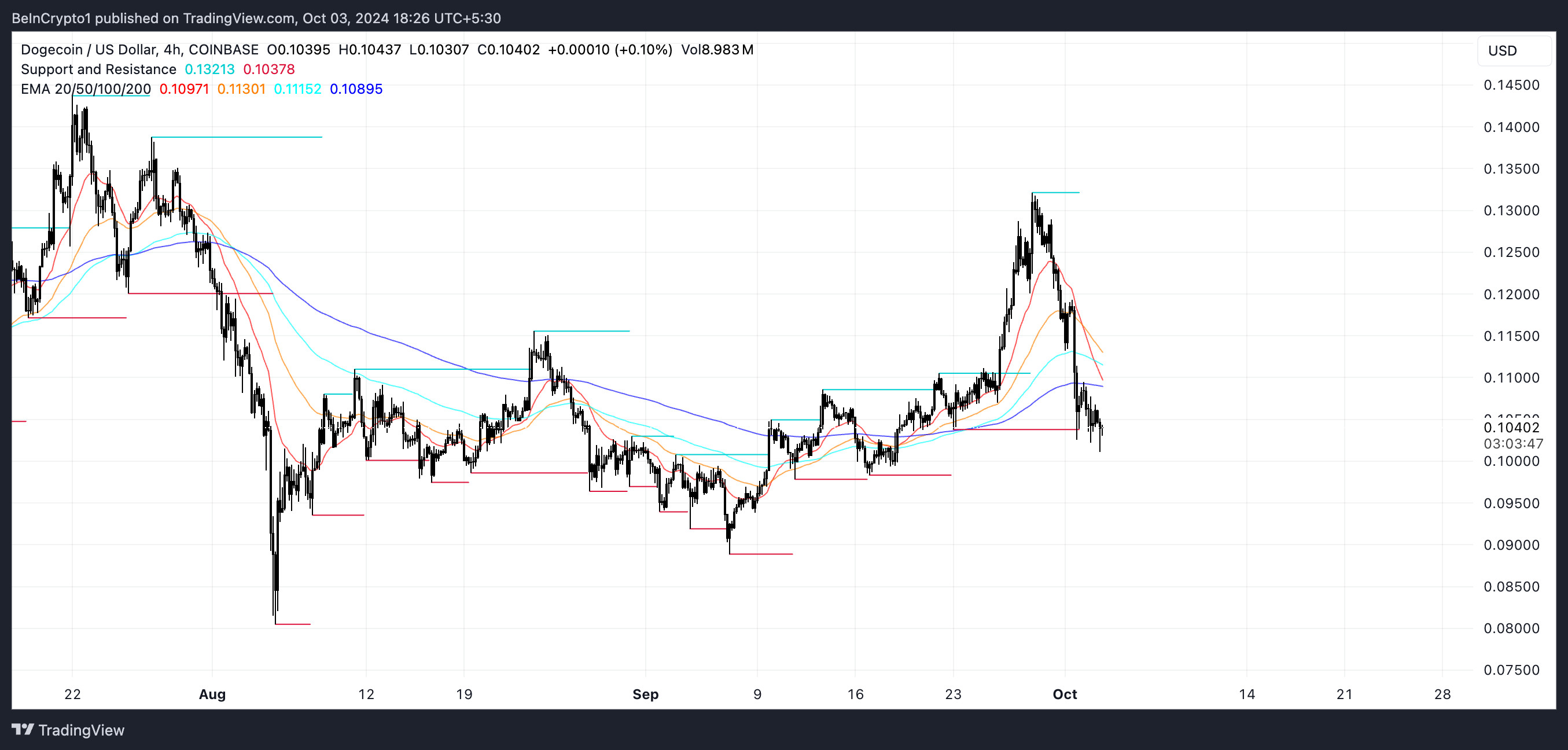 إذا استمر الاتجاه الهابط، من المحتمل أن يختبر سعر DOGE مستوى الدعم حول 0,097 دولار. وإذا لم يصمد هذا الدعم، فقد تكون المستويات الرئيسية التالية 0,088 وربما حتى 0,080 دولار.