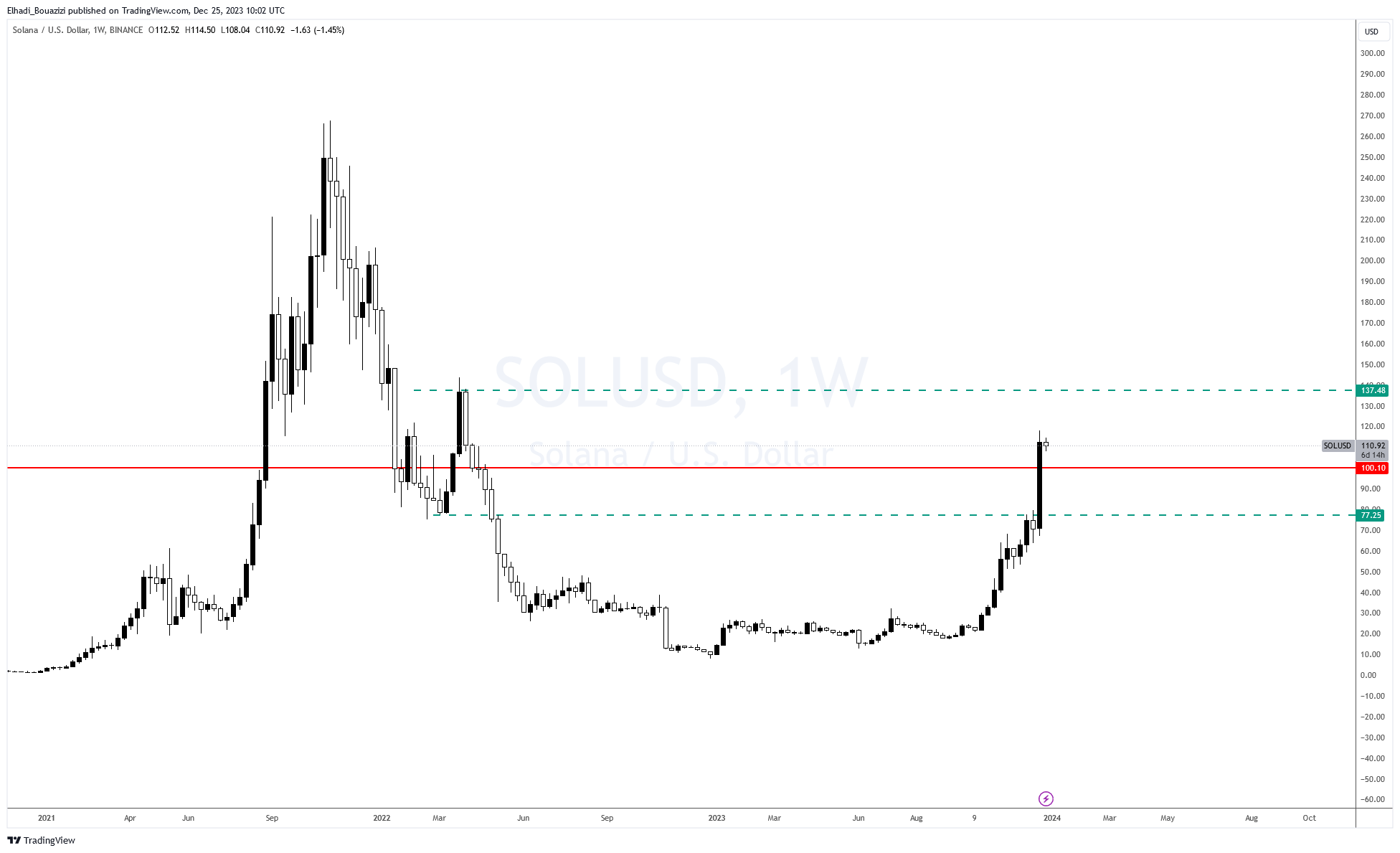 من الناحية الفنية سعر عملة سولانا SOL تمكن من اختراق مستوى 100 دولار والذي يعد حاجز نفسي مهم جدا. هذه التطورات الإيجابية جدا جاءت بعد مرور أكثر من عام على انهيار بورصة FTX الذي ساهم في هبوط سعرها دون 10 دولارات. بسبب حجم الاستثمارات الكبيرة لهذه الأخيرة في مشروع شبكة سولانا التي كانت تسمى "قاتلة إيثيريوم".