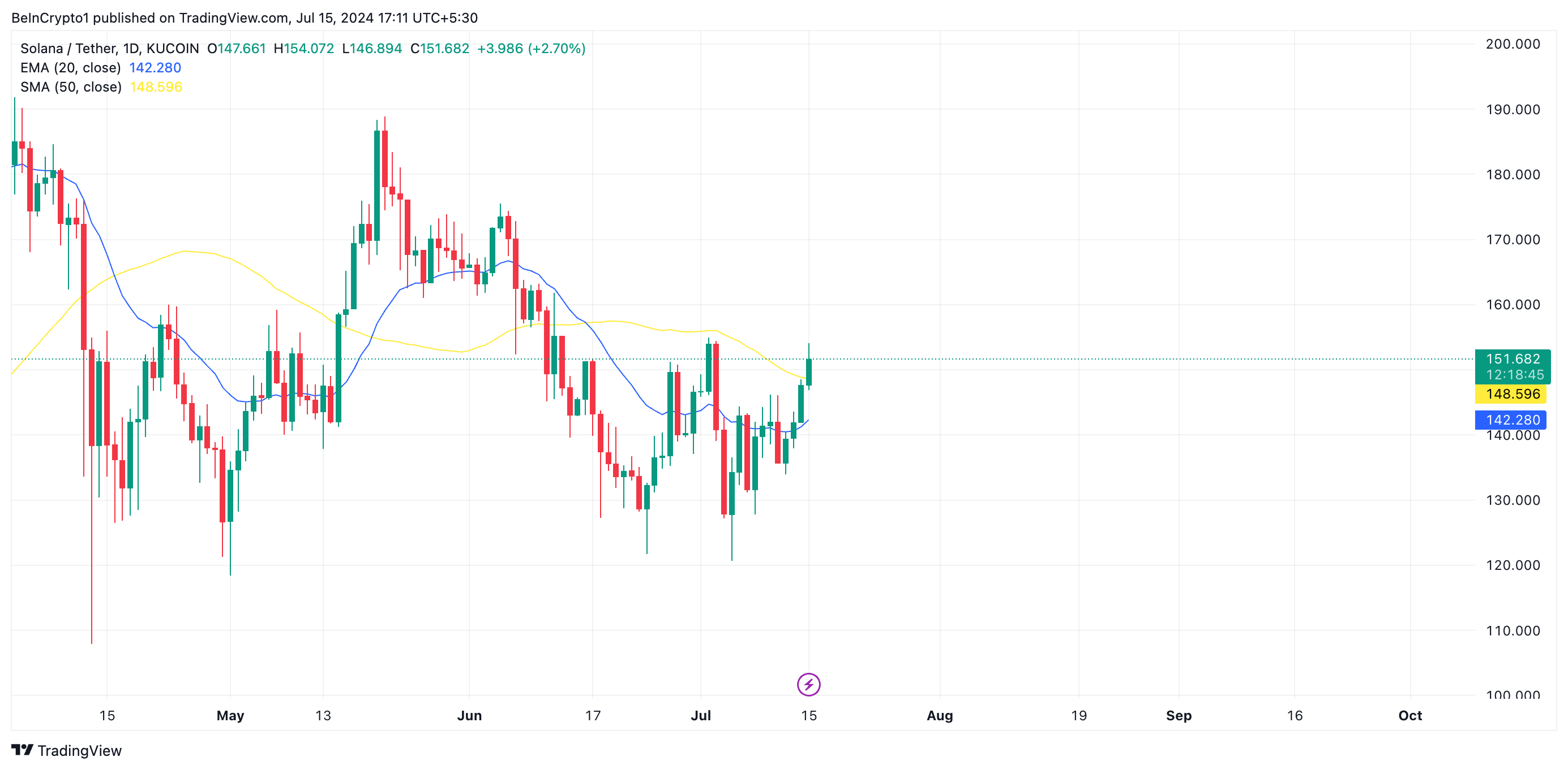 دفعت الزيادة التي شهدتها عملة سولانا SOL على مدى ثلاثة أيام قيمتها إلى ما فوق المتوسط المتحرك الرئيسي. أغلقت العملة الرقمية البديلة فوق المتوسط المتحرك البسيط لمدة 50 يوماً (SMA) يوم أمس، بعد أن تجاوزت في البداية المتوسط المتحرك الأسي لمدة 20 يوماً (EMA) في 6 يوليو.