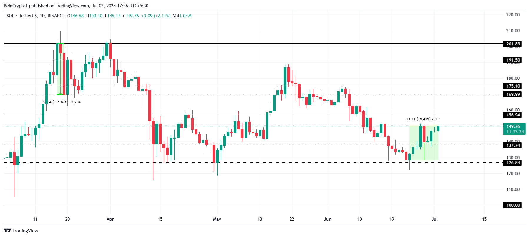 سعر سولانا، وقت كتابة هذا التقرير، يقل قليلاً عن علامة 150 دولارًا. خلال الأيام القليلة الماضية، سجلت العملة البديلة نموًا مستقرًا، ولو ليوم واحد، بارتفاع نسبته 16%. الآن، تهدف SOL إلى استعادة 156 دولارًا كدعم.