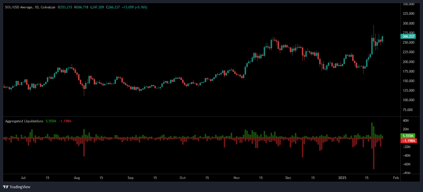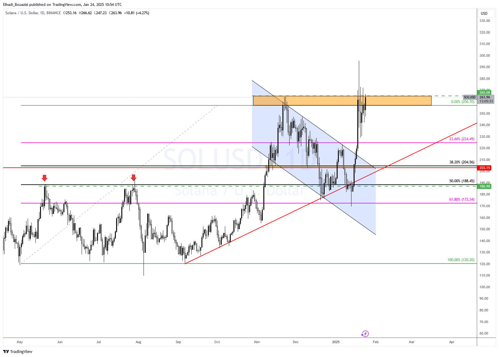 الأمر المثير للانتباه من الناحية الفنية البحتة، أنه رغم قوة زخم الصعود الصاروخي الذي صاحب إطلاق عملة ترامب و من بعده عملة ميلانيا. إلا أن سعر SOL فشل في اختراق مستوى منطقة المقاومة في حدود سعر 265 دولار.