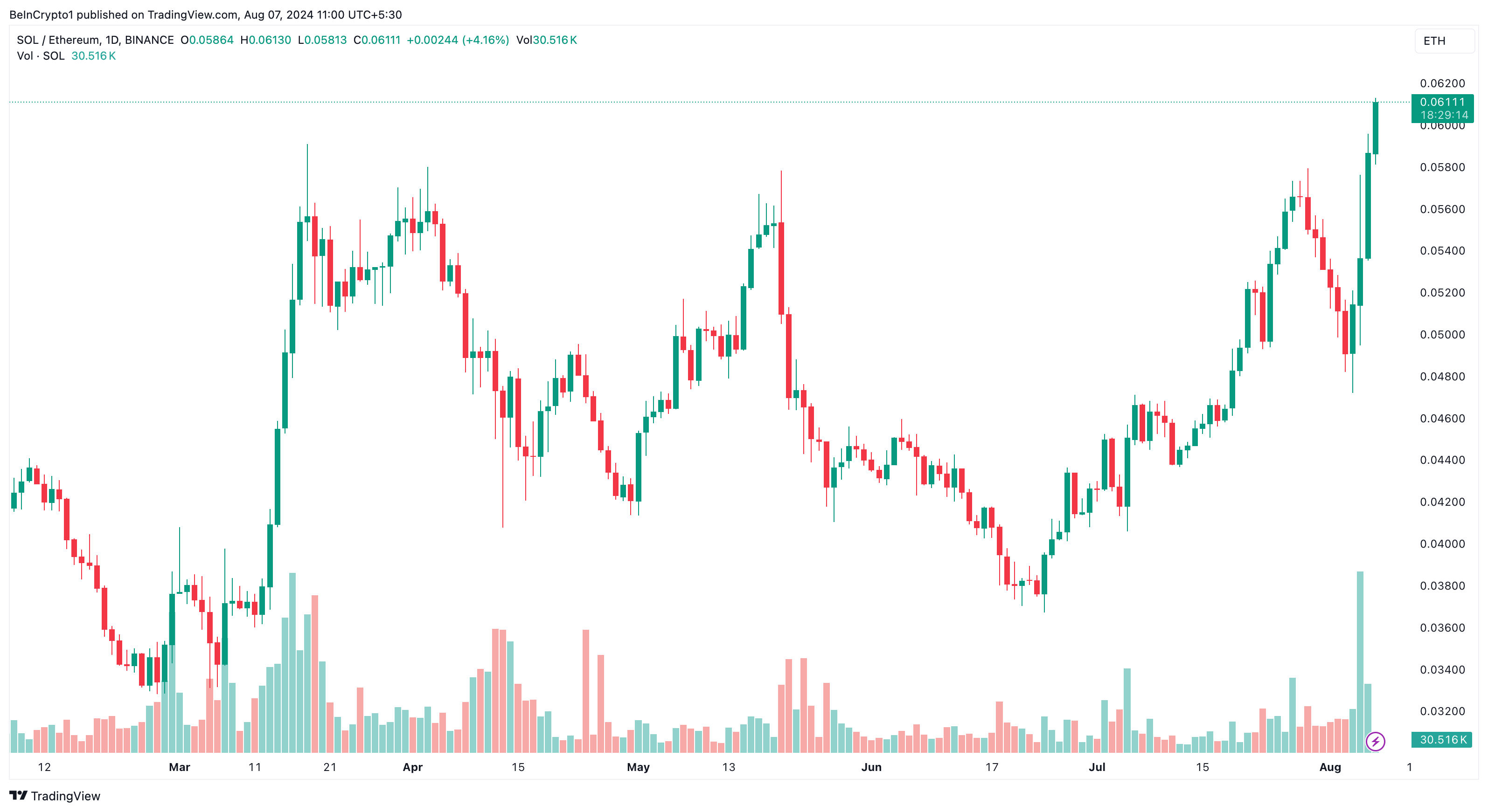 لقد أدى تبعات انهيار السوق يوم الاثنين إلى ظهور أمور مثيرة للاهتمام؛ هذه المرة، سولانا (SOL) في طليعة الأحداث. على وجه التحديد، وصل سعر SOL إلى أعلى مستوى جديد على الإطلاق مقابل إيثريوم (ETH).