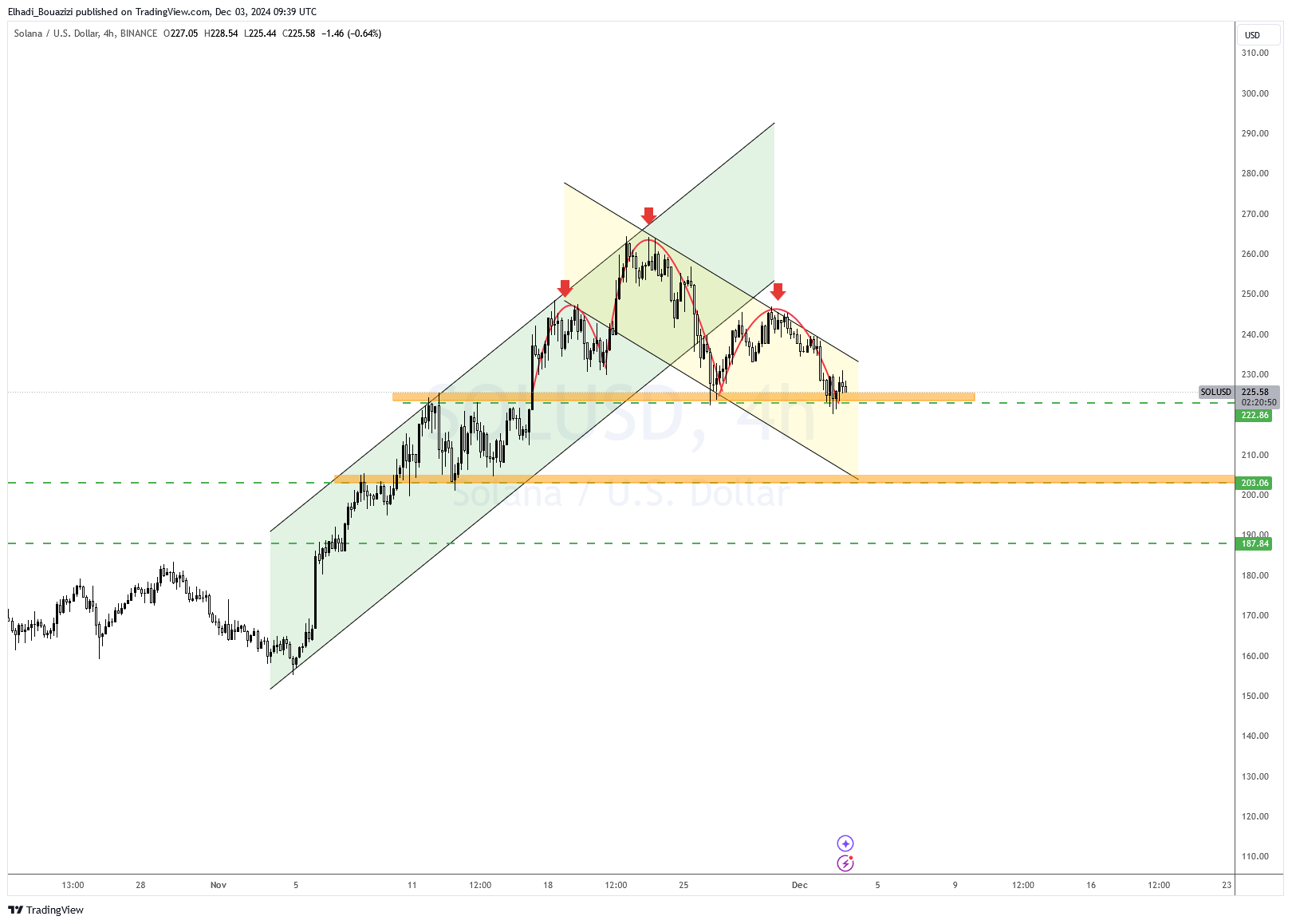• سعر سولانا يشكل نموذج الرأس والكتفين الانعكاسي مع خط عنق عند 222 دولار، ما يشير لمزيد من الهبوط عند كسره.