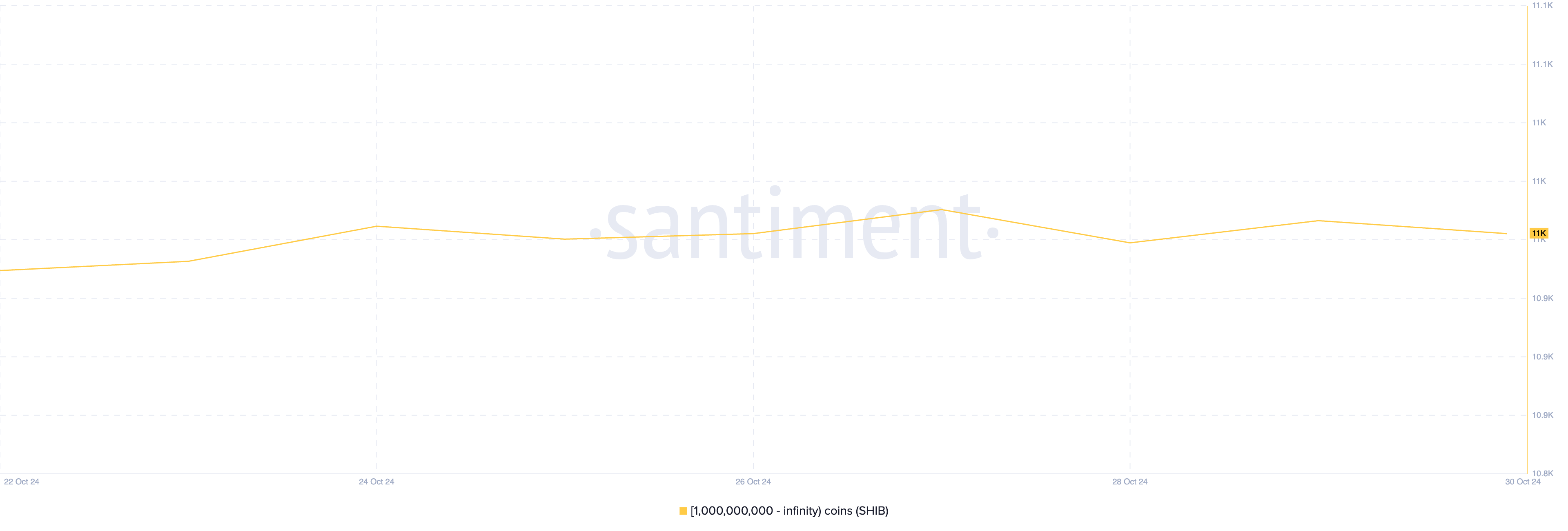 ظل عدد الحيتان التي تمتلك ما لا يقل عن مليار رمز SHIB ثابتًا، حيث يتراوح حول 11,000 خلال الأيام القليلة الماضية.