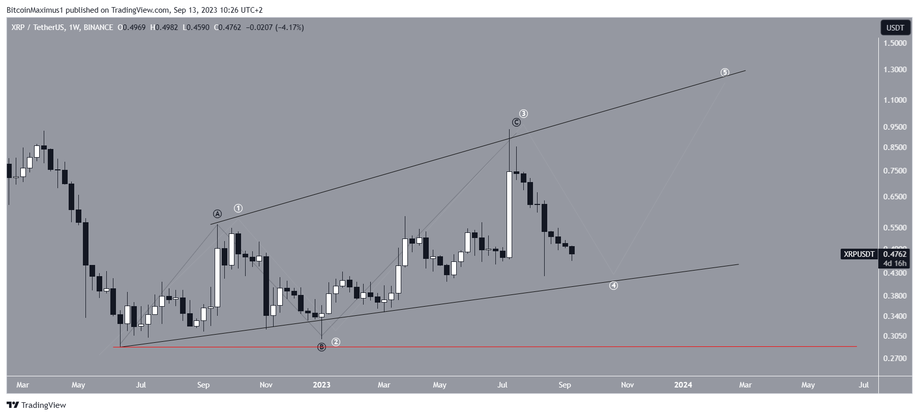 ويشير العد الصعودي إلى أن عملة XRP موجود في الموجة الرابعة من الحركة التصاعدية المكونة من خمس موجات (اللون الأبيض). كما اتخذت الزيادة شكل قطري متقدم ومتوسع، ومن ثم التداخل بين الموجتين الرابعة والواحدة.