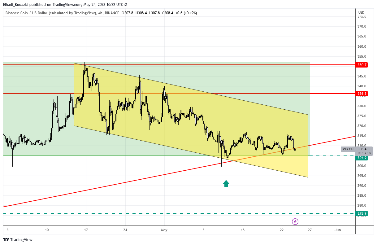 يتداول حاليًا سعر عملة BNB في وقت كتابة هذا التقرير بالقرب من مستوى الدعم 300 دولار. الذي سبق واختبره عدة مرات في الأسبوعين الماضيين ولكنه فشل في كسره. ولكن من الواضح أن هناك قوة ضغط من البائعين.