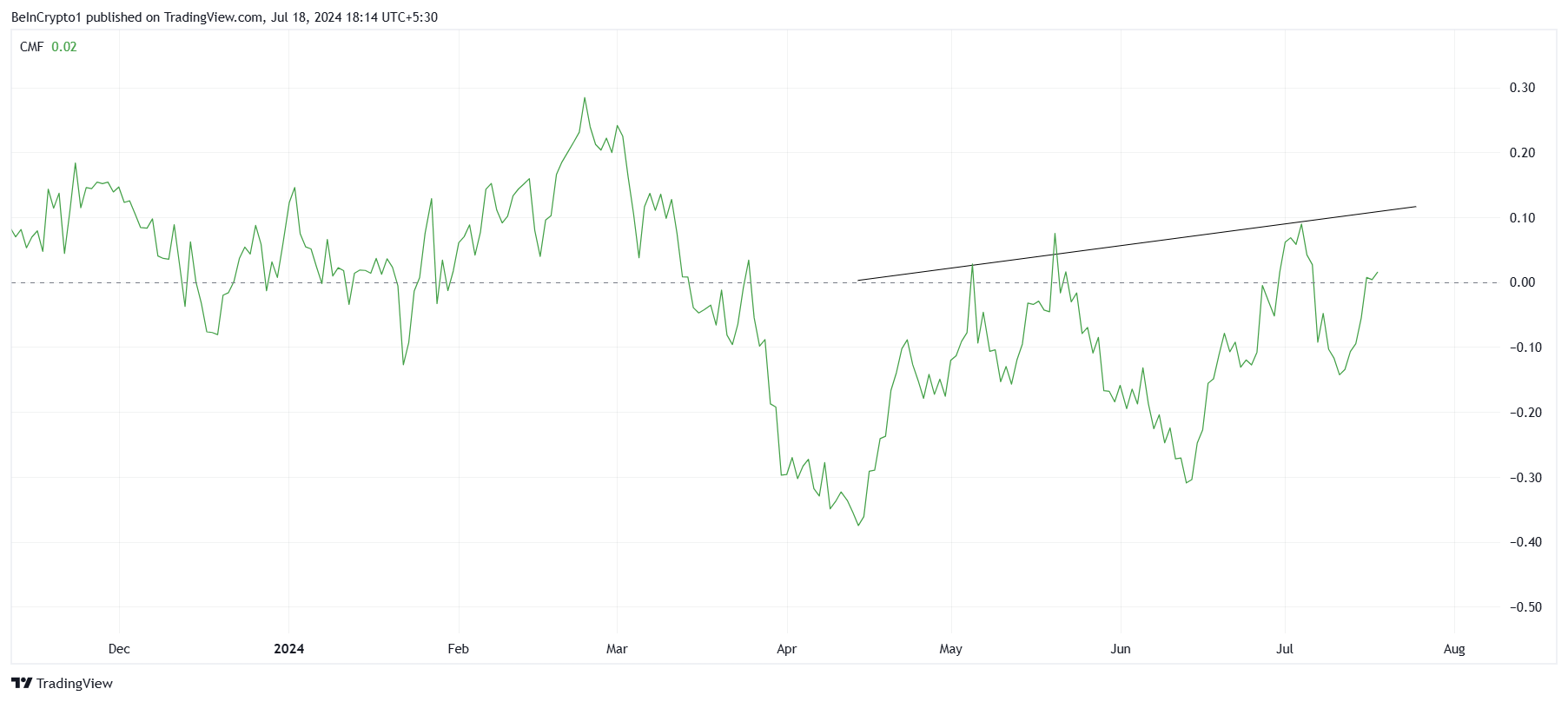 من ناحية أخرى،يقدم مؤشر تدفق الأموال Chaikin (CMF) صورة متناقضة. على الرغم من الاتجاه الصعودي المستمر، لا يزال المؤشر أقل من خط الصفر. يشير هذا إلى أن التدفقات ضعيفة، مما قد يقوض النمو الأخير الذي شوهد في مؤشر القوة النسبية.