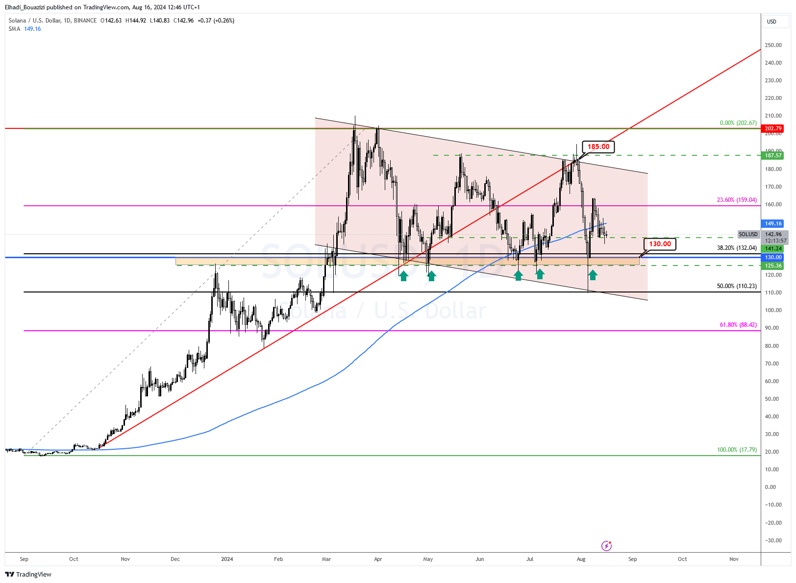 سعر SOL يتداول حاليا ، بالقرب المستوى الدعم الثانوي 140 دولار، أعتقد أن أي هبوط نحو مستوى 130 دولار يمثل فرص جيدة للشراء، و الهدف يكون مستوى 180 دولار.