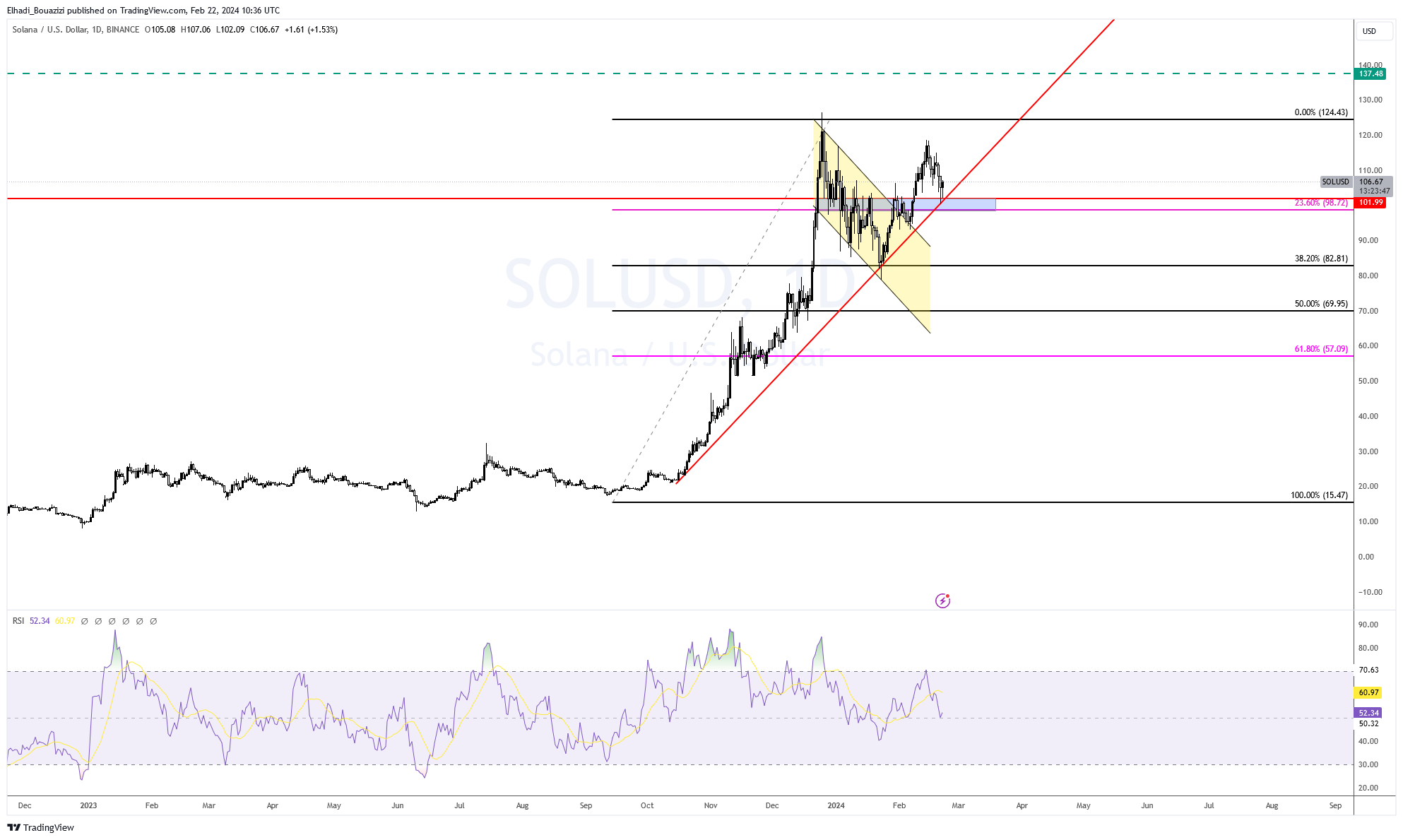 فنيا التراجعات في سعر عملة سولانا SOL و رغم أنها تعاكس اتجاه السوق إلا أنها تبقى في نطاق تصحيح سعري العادي. حيث أن السعر ما زال فوق مستوى الدعم 100 دولار. الذي يتشكل من قمم سابقة و أيضا مستوى تصحيح فيبوناتشي 23.6%.