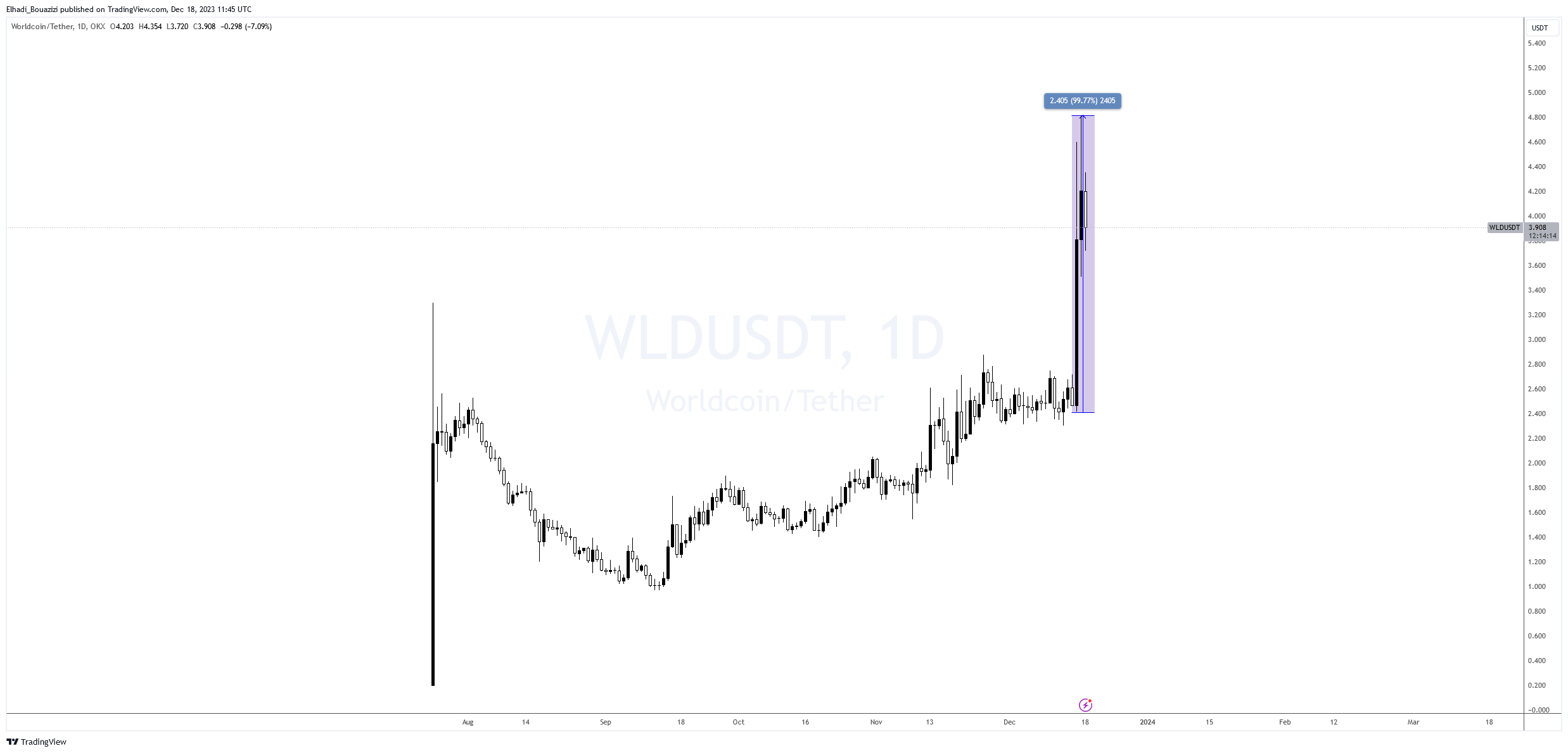 و هو الذي أدى ذلك إلى انفجار سعر علمتها الأصلية WLD بنسبة 100% منذ تاريخ الإعلان في 13 ديسمبر. الذي بلغ أعلى مستوياته على الإطلاق عند مستوى 4.80 دولار.