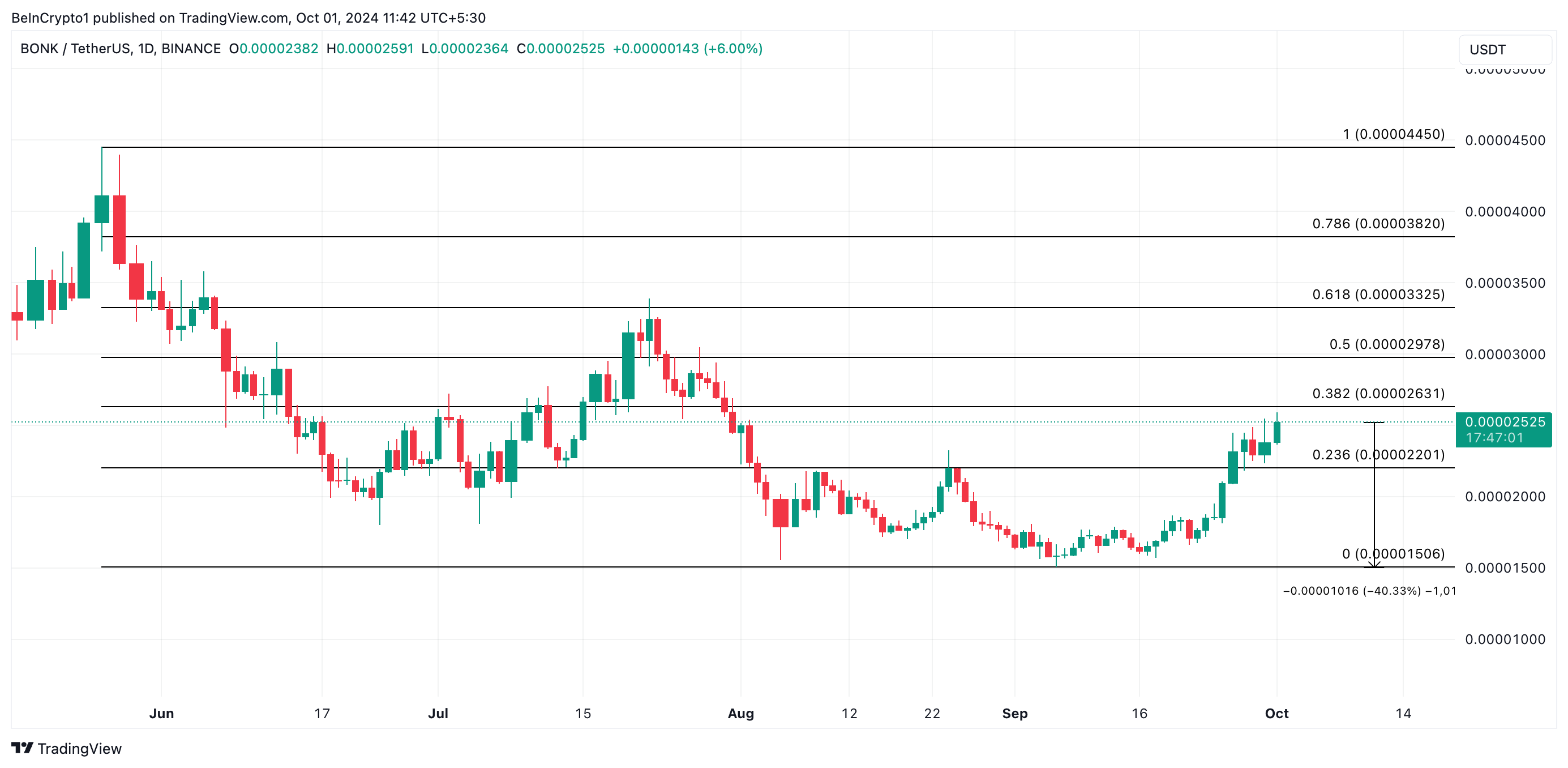 ومع ذلك، قد يؤدي اختبار ناجح لمستوى المقاومة إلى استئناف عملة BONK لاتجاهها الصاعد. مما يعزز الشعور الإيجابي تجاه العملة البديلة. في هذا السيناريو، قد يرتفع سعر BONK نحو 0,000033$، مما قد يمهد الطريق لتحقيق أعلى مستوى في أربعة أشهر عند 0,000044$.
