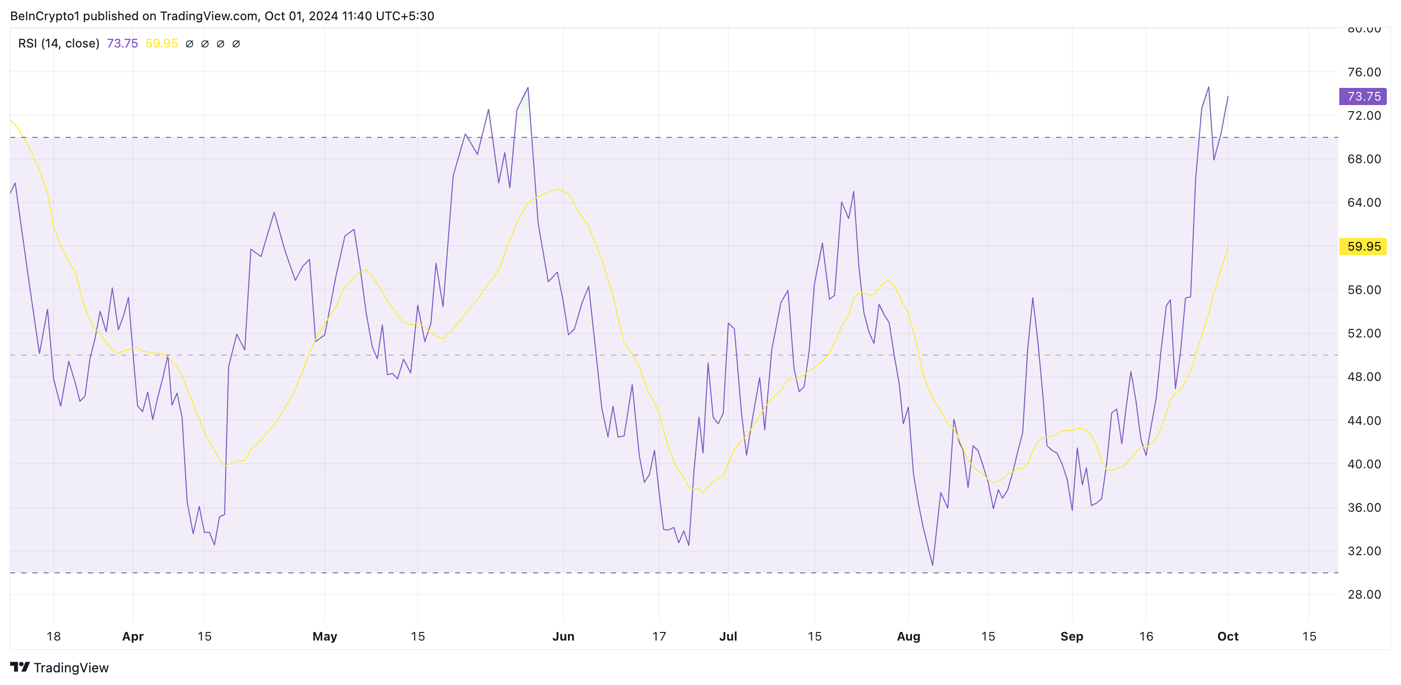 يؤكد مؤشر القوة النسبية (RSI) لـعملة BONK هذه النظرة. عند 74,33، يشير هذا المؤشر، الذي يقيس ظروف السوق المبالغ فيها أو المنخفضة للأصل، إلى أن العملة الميمية مبالغ في شرائها. يلمح قراءة RSI عند 73,75 إلى استنفاد المشترين المحتمل، والذي غالبًا ما يتبعه انخفاض في السعر.