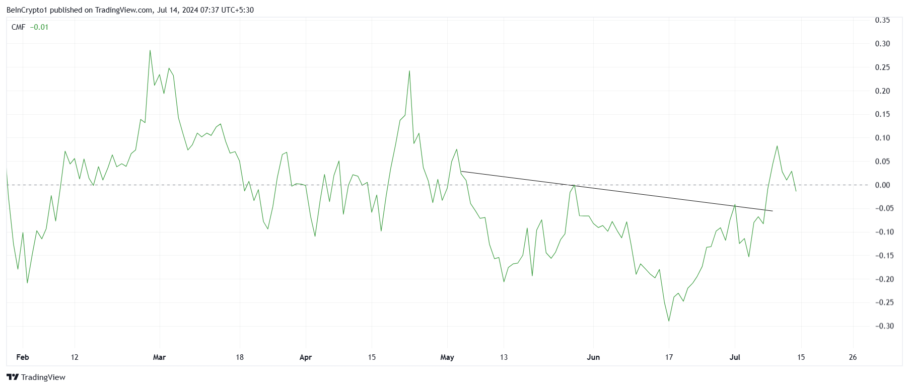 يلاحظ سعر عملة BONK تأثير التشاؤم المتزايد تجاه العملة البديلة. مؤشر تدفق الأموال لبونك (CMF) قد اخترق اتجاهه الهابط مؤخرًا، مما يشير إلى تحول محتمل في معنويات السوق. ومع ذلك، يبدو أن هذا الزخم التصاعدي يتلاشى، مما يثير القلق بشأن استدامة هذا الاتجاه.