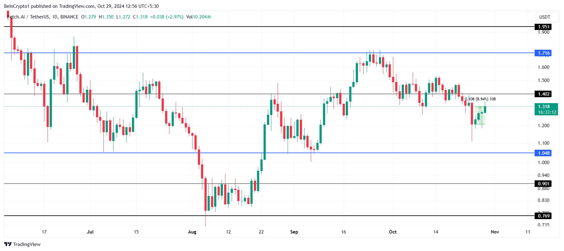 ارتفع سعر عملة FET بنسبة 9% خلال الأيام الأربعة الماضية، على الرغم من أن هذه المكاسب لم توفر بعد عوائد كبيرة للمستثمرين. المقاومة الكبيرة التالية لـ FET تقع عند 1,40$، وهي حاجز يجب تجاوزه قبل محاولة جديدة للوصول إلى علامة 1,71$. هذا المستوى حاسم في تحديد الخطوة التالية للعملة البديلة.