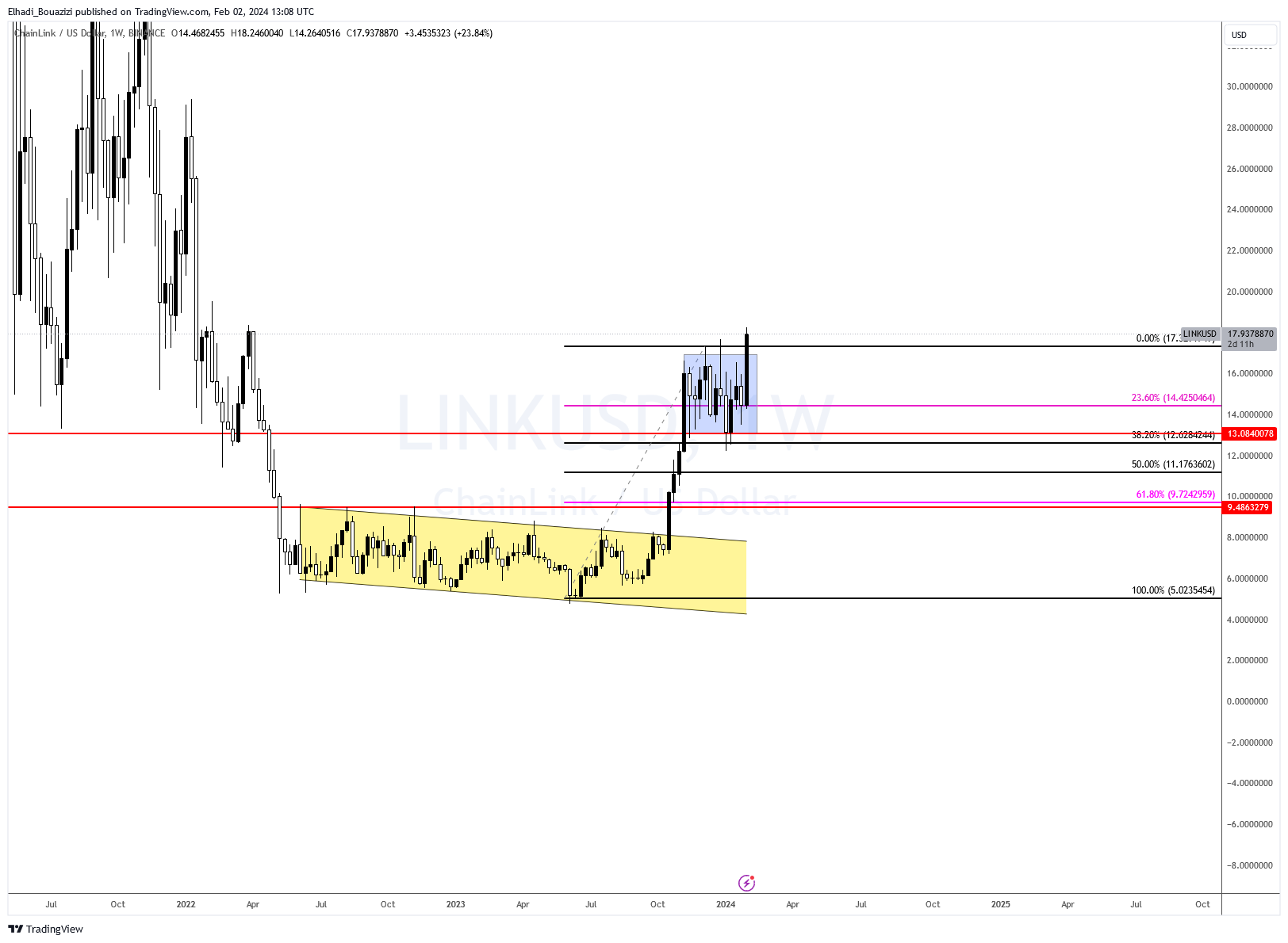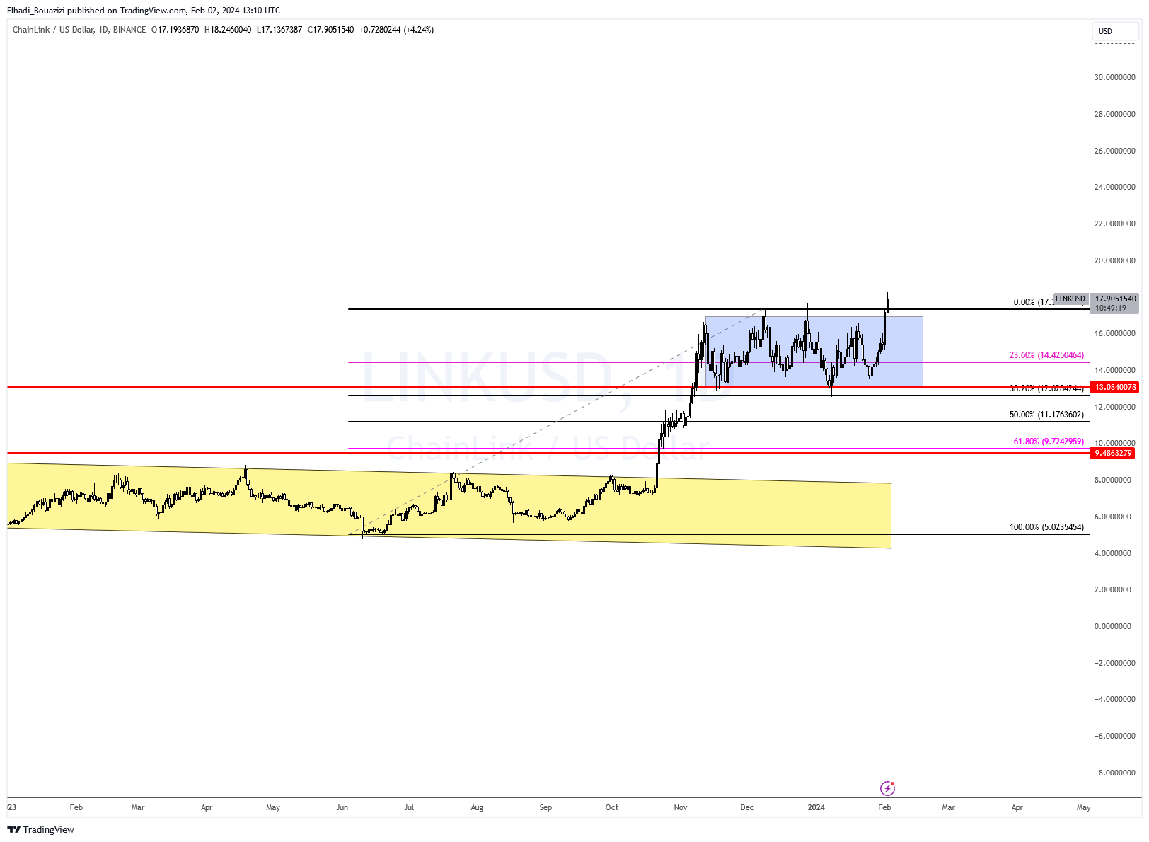 في تداولات يوم الجمعة سجل سعر عملة LINK التابعة الخاصة بشبكة تشينلينك Chainlink ارتفاع قوي و تبلغ مستوى قياسي جديد هو الأعلى في مدة 22 شهرًا . و لقد تمكن السعر من الخروج من مسار التداول الجانبي الذي يتداول فيه طيلة مدة ثلاثة أشهر الماضية