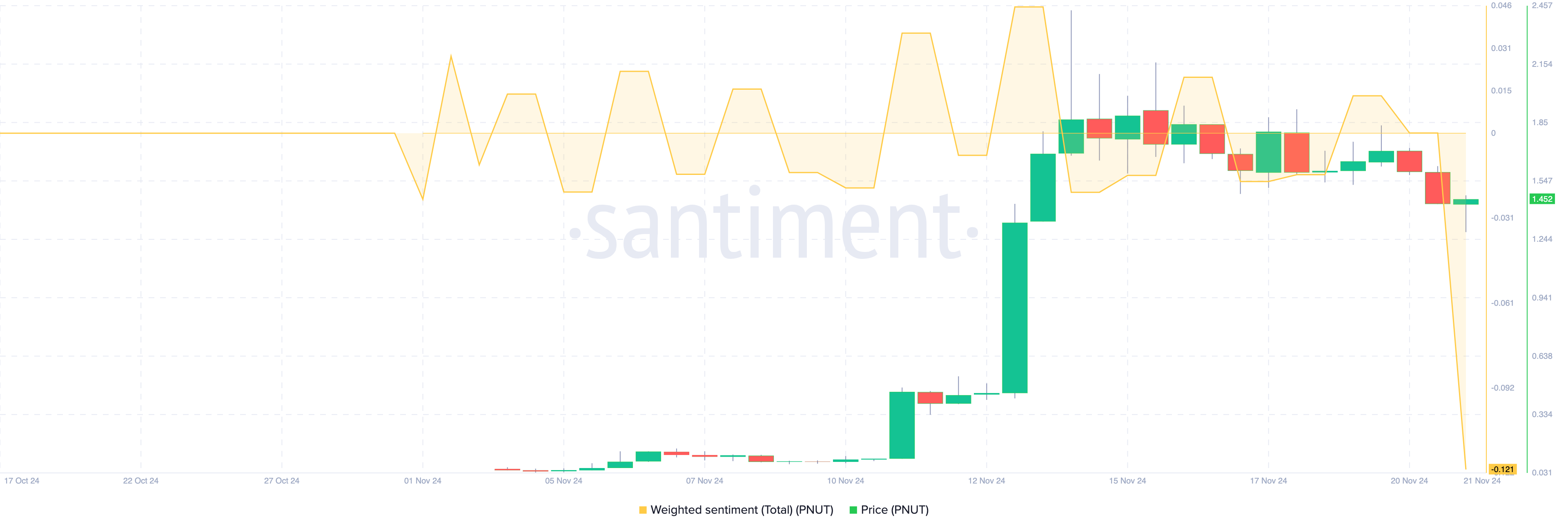 أحد المؤشرات الرئيسية التي تشير إلى احتمال تعافي عملة PNUT هو الشعور الموزون، الذي يقيم تصور السوق باستخدام حجم التواصل الاجتماعي. عادةً ما يعكس الشعور الإيجابي تعليقات السوق الصاعدة، مما يؤدي غالبًا إلى زيادة الطلب ونمو الأسعار. وعلى العكس، يشير الشعور السلبي إلى شعور هبوطي في السوق.