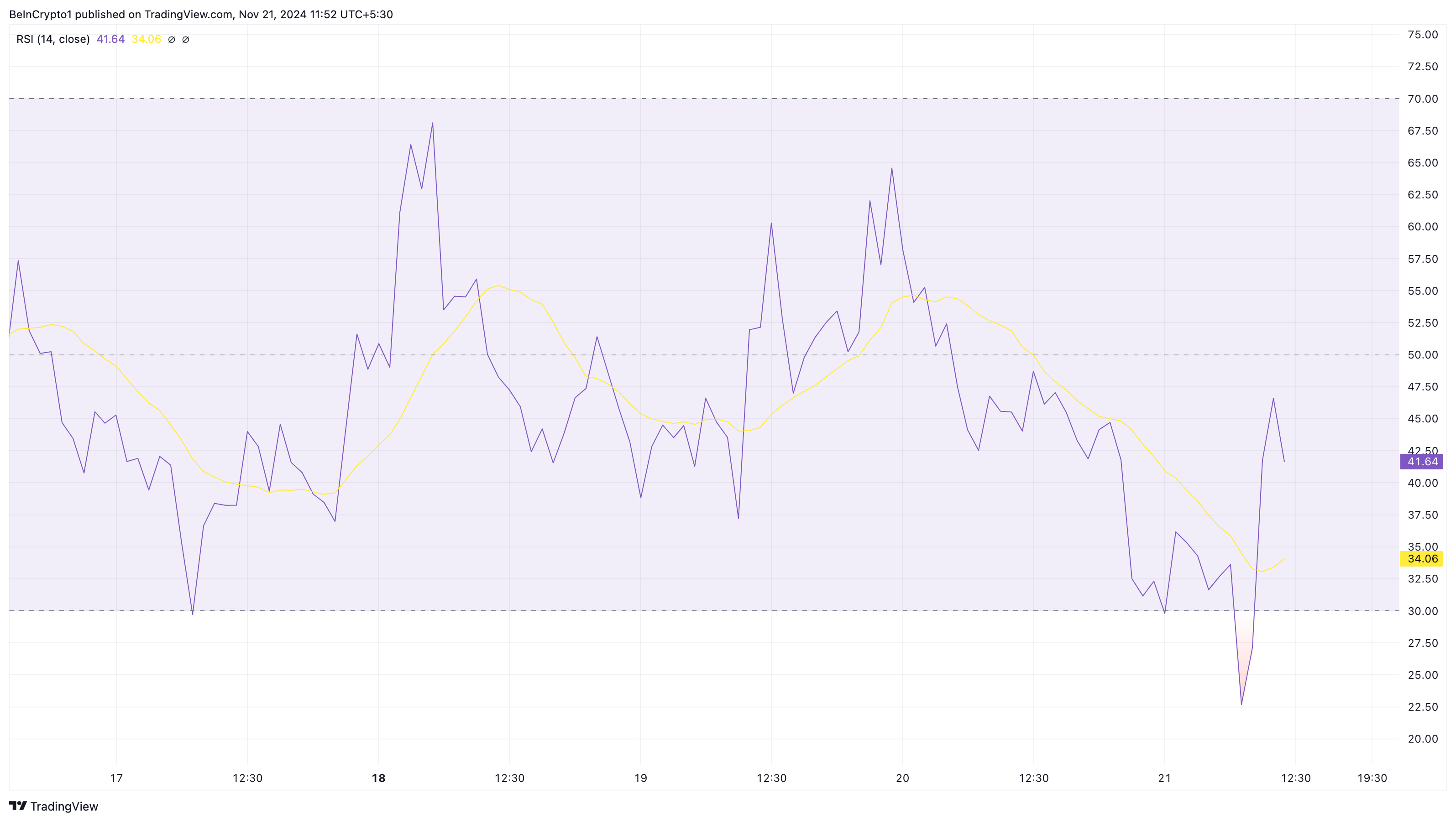 علاوة على ذلك، يعد مؤشر القوة النسبية (RSI) مؤشرًا آخر يشير إلى أن قيمة عملة سولانا الميمية قد تمحو جزءًا من خسائرها. مؤشر القوة النسبية هو مذبذب تقني يستخدم سرعة وحجم تغيرات الأسعار لقياس الزخم.