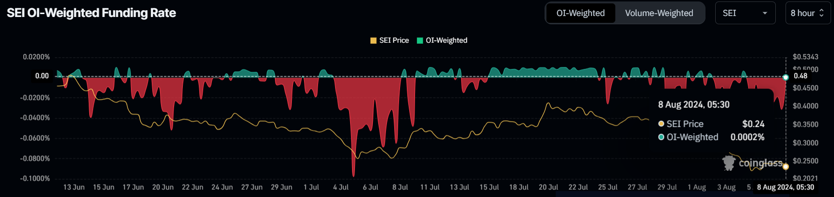 قد يستفيد سعر SEI من تغير المشاعر للمستثمرين الذين كانوا متشائمين مؤخراً تجاه العملة البديلة. علامات ذلك تأتي من تحول معدل تمويل SEI إلى الإيجابية، وهو تطور مشجع للغاية للعملة المشفرة.