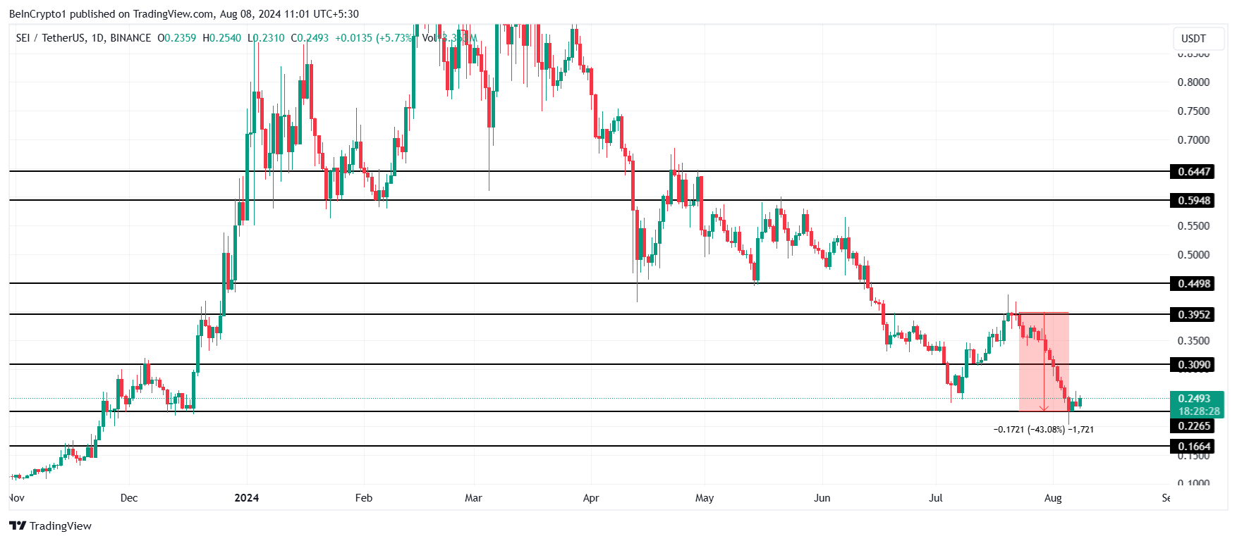 تحويل هذه العقبة إلى دعم سيمكن سعر عملة SEI من الارتداد نحو 0.3952 دولار، متعافيًا من الانهيار الأخير بنسبة 43%.