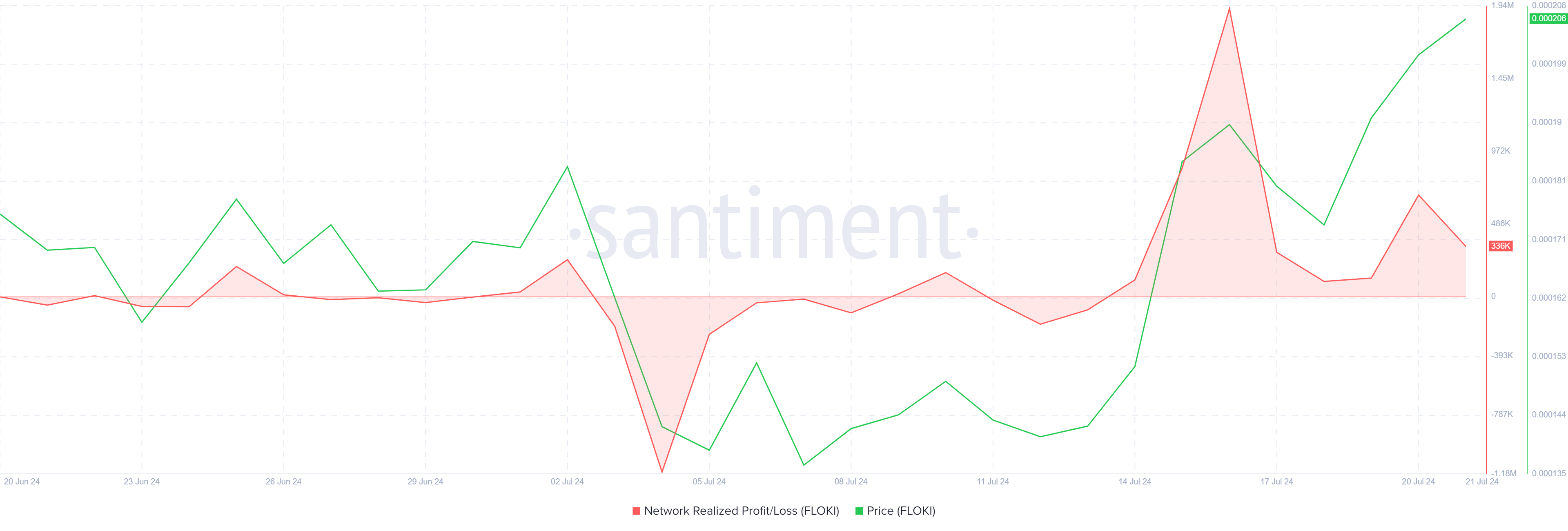 قد يتحمل سعر فلوكي (FLOKI) العبء لنقص الثقة المتزايد بين المستثمرين. الشبكة تشهد زيادة في الأرباح المحققة، مما يدل على أن حاملي فلوكي يبيعون ممتلكاتهم. هذا الاتجاه يشير إلى أن العديد من المستثمرين يستفيدون من مستويات الأسعار الحالية لتأمين المكاسب.