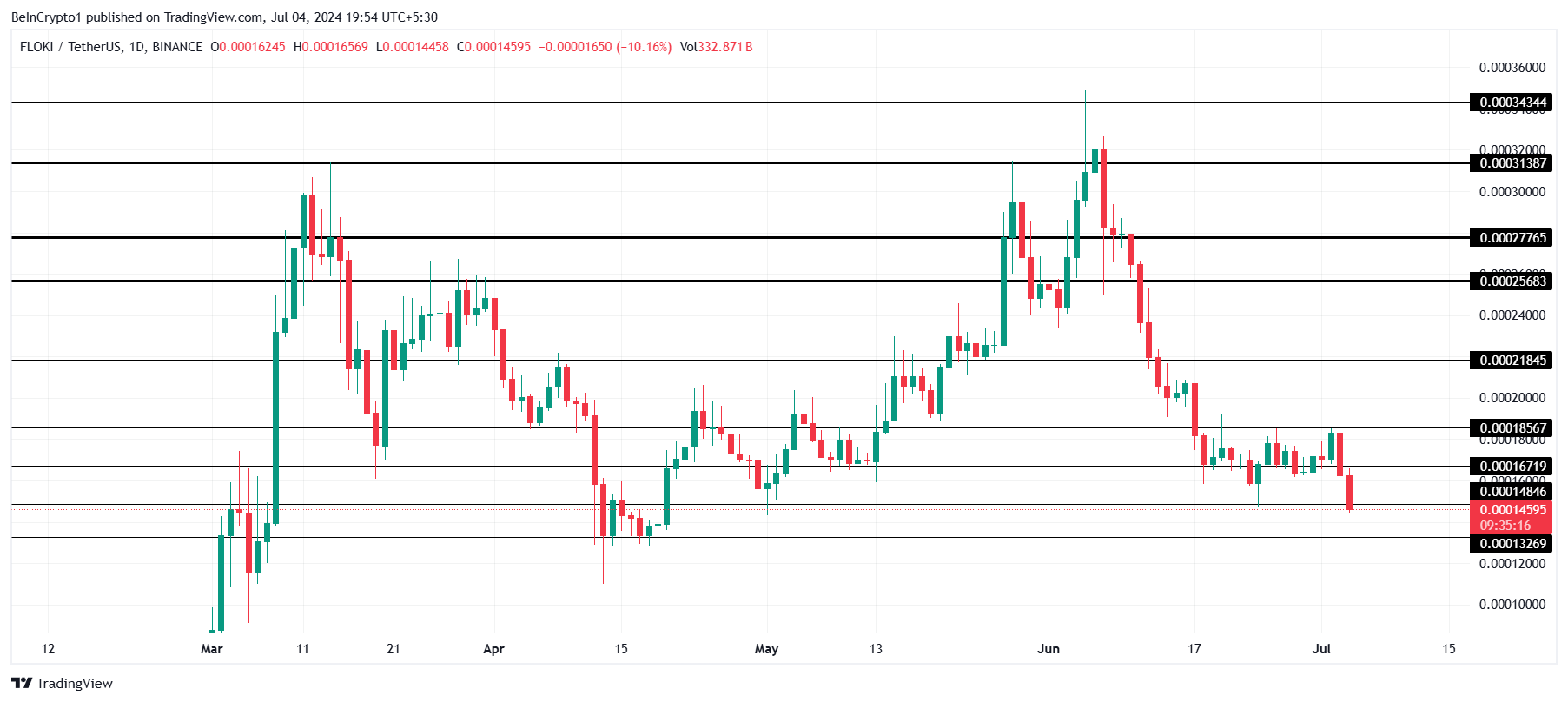 انخفض سعر فلوكي (FLOKI) بأكثر من 21% خلال الـ 24 ساعة الماضية، مما أدى إلى انخفاض العملة الميمية من 0,0001856 دولار إلى 0,0001459 دولار. العملة البديلة الآن قريبة من آخر حاجز لها عند 0,0001326 دولار، والذي إذا انخفضت دونه، قد يؤدي إلى سقوط حر مع انخفاض السعر دون 0,0001000 دولار.