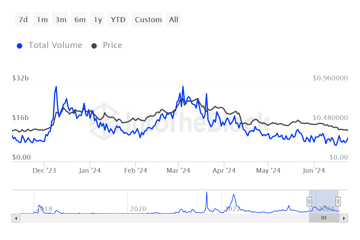 قد يتأثر سعر كاردانو بتراجع الثقة الصاعدة بينما تواصل الحيتان الابتعاد عن المشاركة في الشبكة. لقد شهد الحجم الإجمالي المتولد من المعاملات التي تزيد قيمتها عن 100,000 دولار انخفاضًا ملحوظًا، وإن كان بشكل تدريجي.
