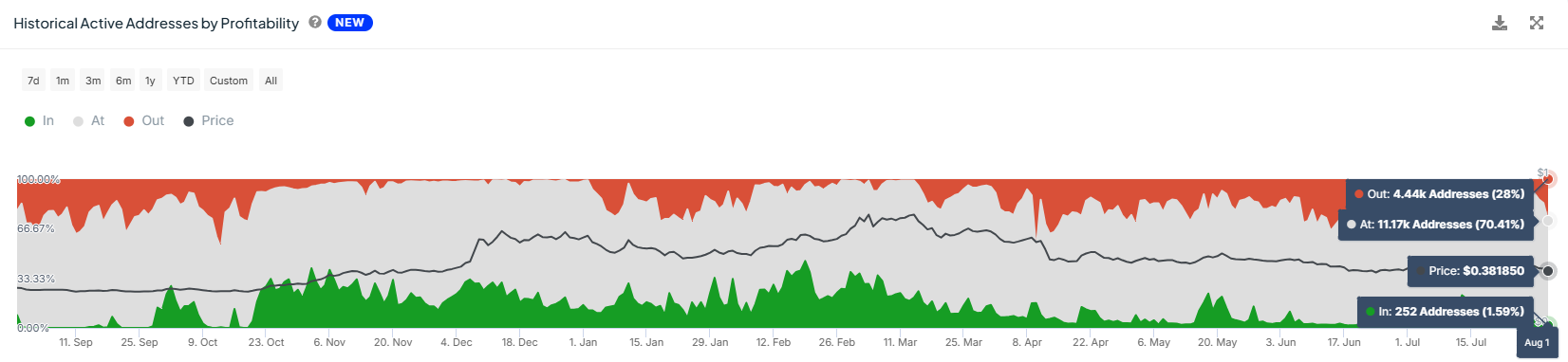 وفقًا لمؤشر الدخول/الخروج العالمي (GIOM)، في وقت سابق من هذا الأسبوع، تحولت 3.7 مليار ADA بقيمة حوالي 1.4 مليار دولار إلى خسائر. تم شراء هذا المعروض بين 0,39 و0,41 دولار، والتي انخفضت ADA من خلالها بعد فقدان الدعم عند 0,40 دولار.
