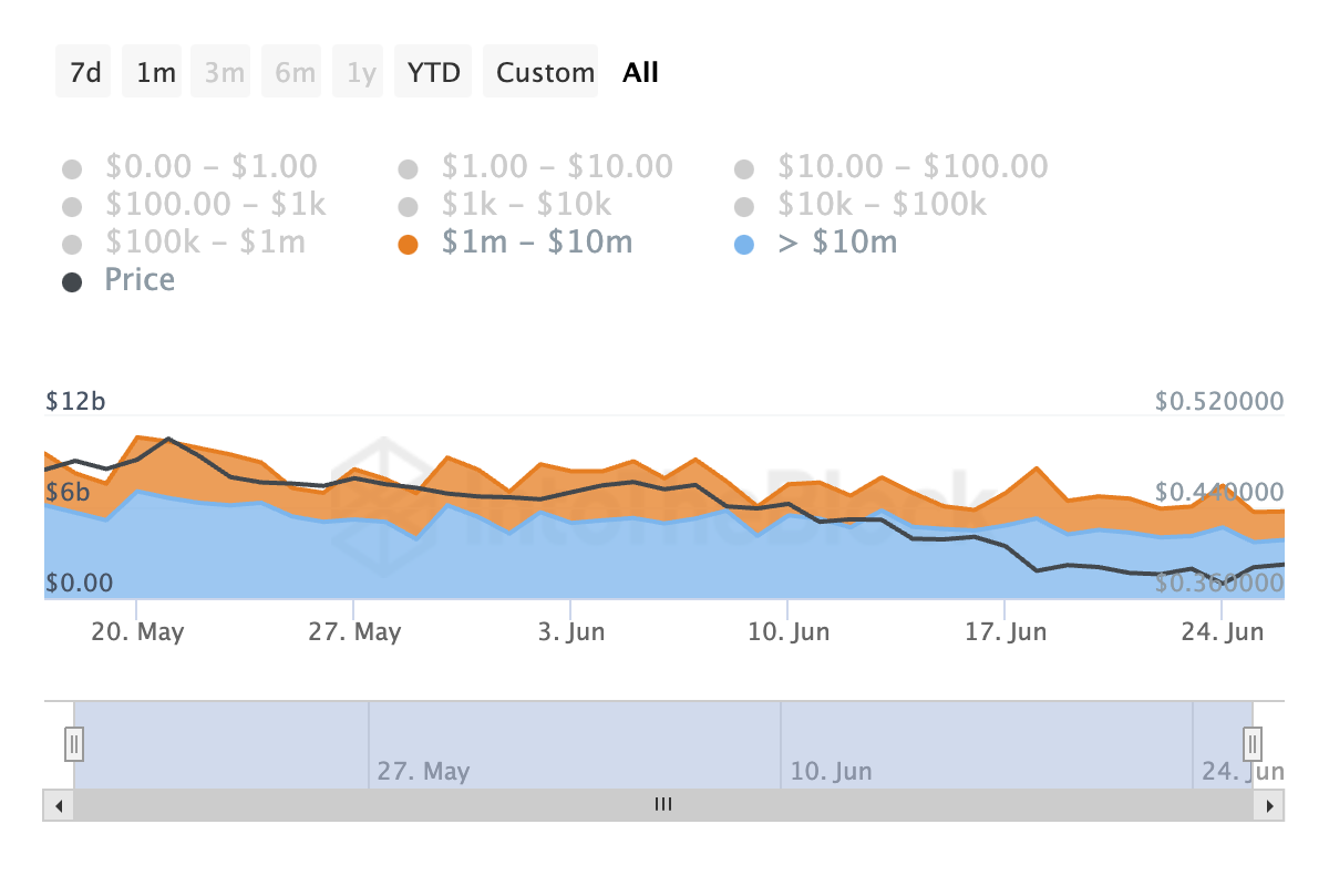 شهدت كاردانو (ADA) انخفاضًا في حجم المعاملات الكبيرة خلال الشهر الماضي. على سبيل المثال، خلال تلك الفترة، انخفض العدد اليومي لمعاملات ADA التي تتراوح قيمتها بين مليون و10 ملايين دولار بنسبة 33%.