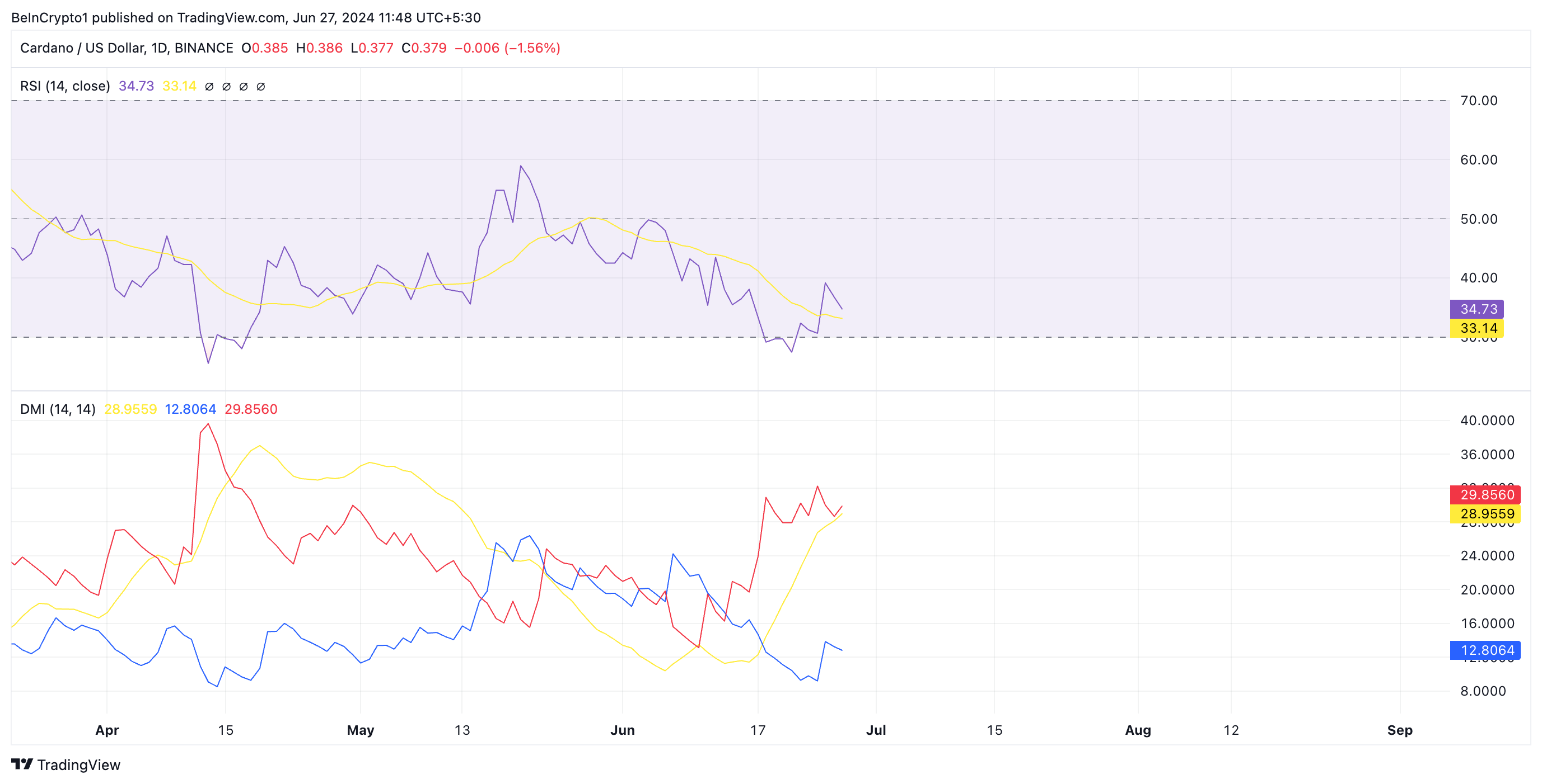 كما تم تقييمه على الرسم البياني اليومي، فإن بعض المؤشرات الفنية الرئيسية لـ ADA تصور انخفاض الطلب على العملة بين المشاركين في السوق. على سبيل المثال، انخفض مؤشر القوة النسبية (RSI) لها إلى ما دون خط الـ50 المحايد. قيمته الآن 34,12 وهو في اتجاه هبوطي في وقت النشر.