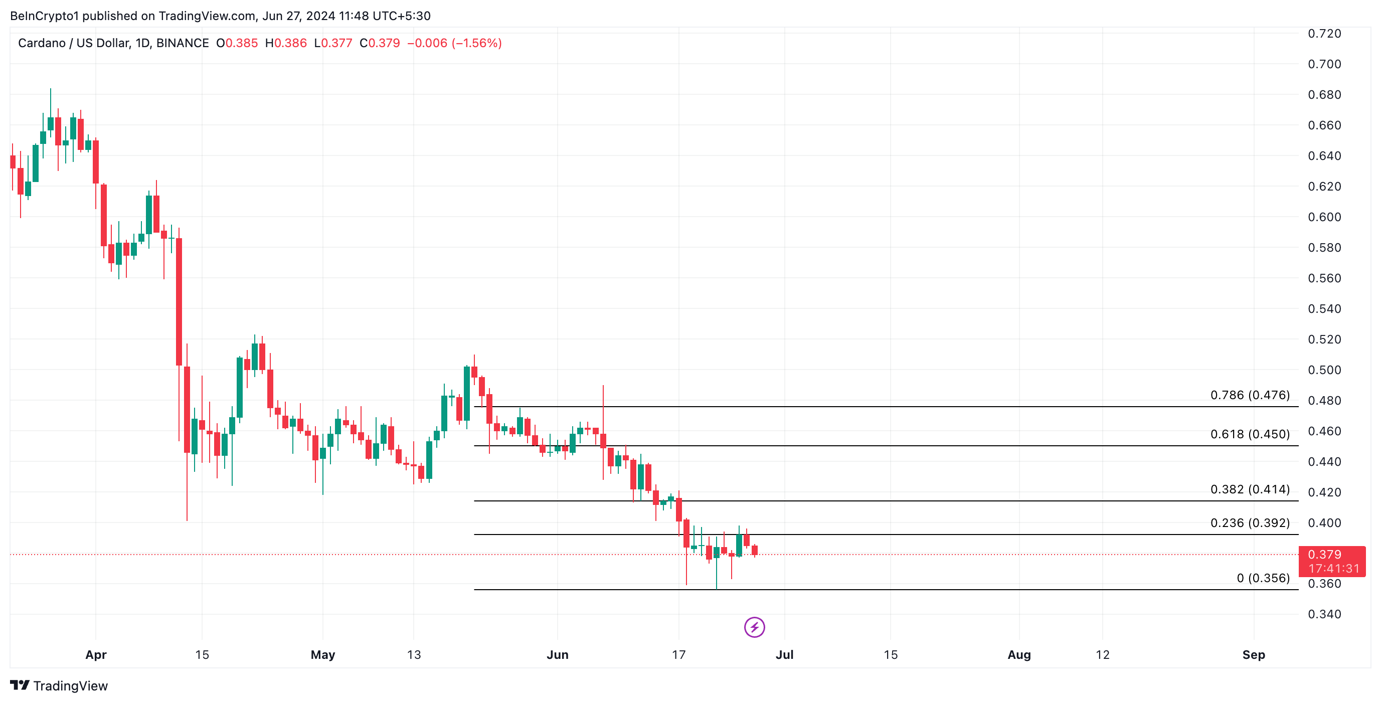 أثر الانخفاض العام في السوق الشهر الماضي على سعر كاردانو (ADA)، حيث يتداول الآن بسعر 0,37 دولار بعد أن شهد انخفاضًا في السعر بنسبة 18% خلال الثلاثين يومًا الماضية.