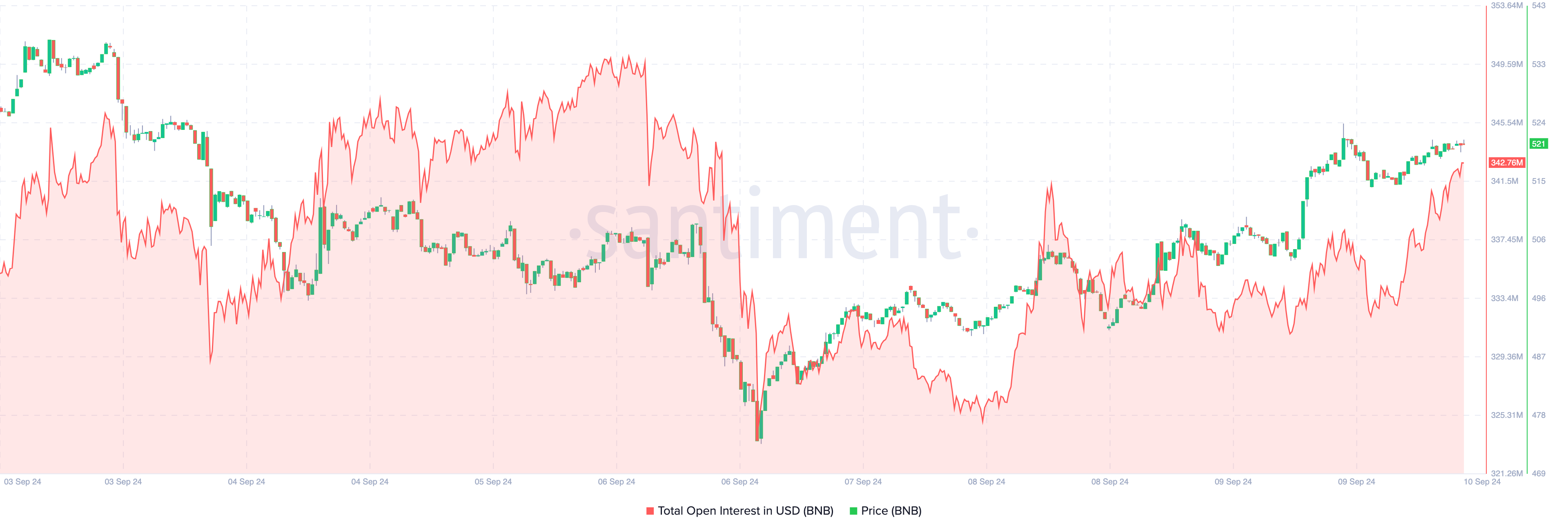 وفقًا لـ Santiment، كان الاهتمام المفتوح (OI) لـBNB تحت 325 مليون دولار الجمعة الماضية. وحتى كتابة هذه السطور، ارتفع OI إلى 342 مليون دولار، مما يشير إلى أن المشاركين في السوق يزيدون من مراكزهم ويكتسبون تعرضًا أكبر للعملة.