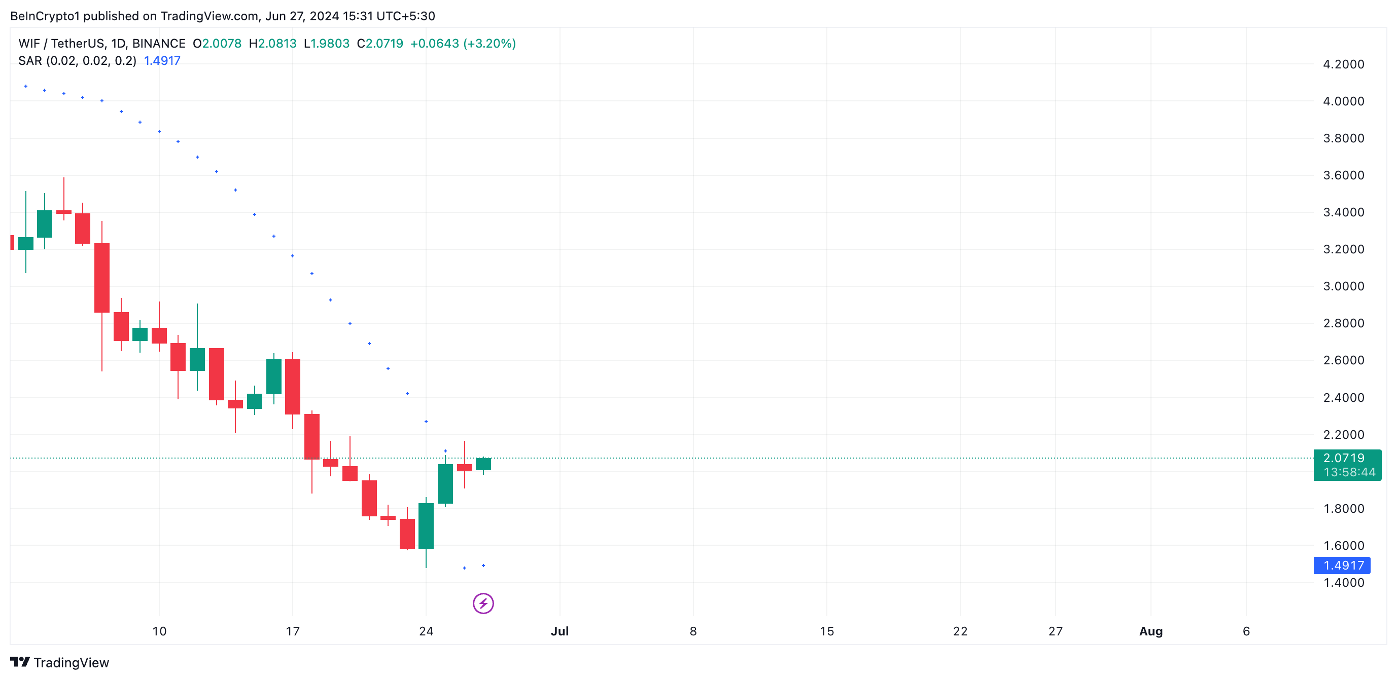 عند تقييمها على مخطط يومي، تقع نقاط مؤشر وقف وعكس الحركة البارابولي (SAR) الخاص بـ WIF حاليًا تحت سعرها.