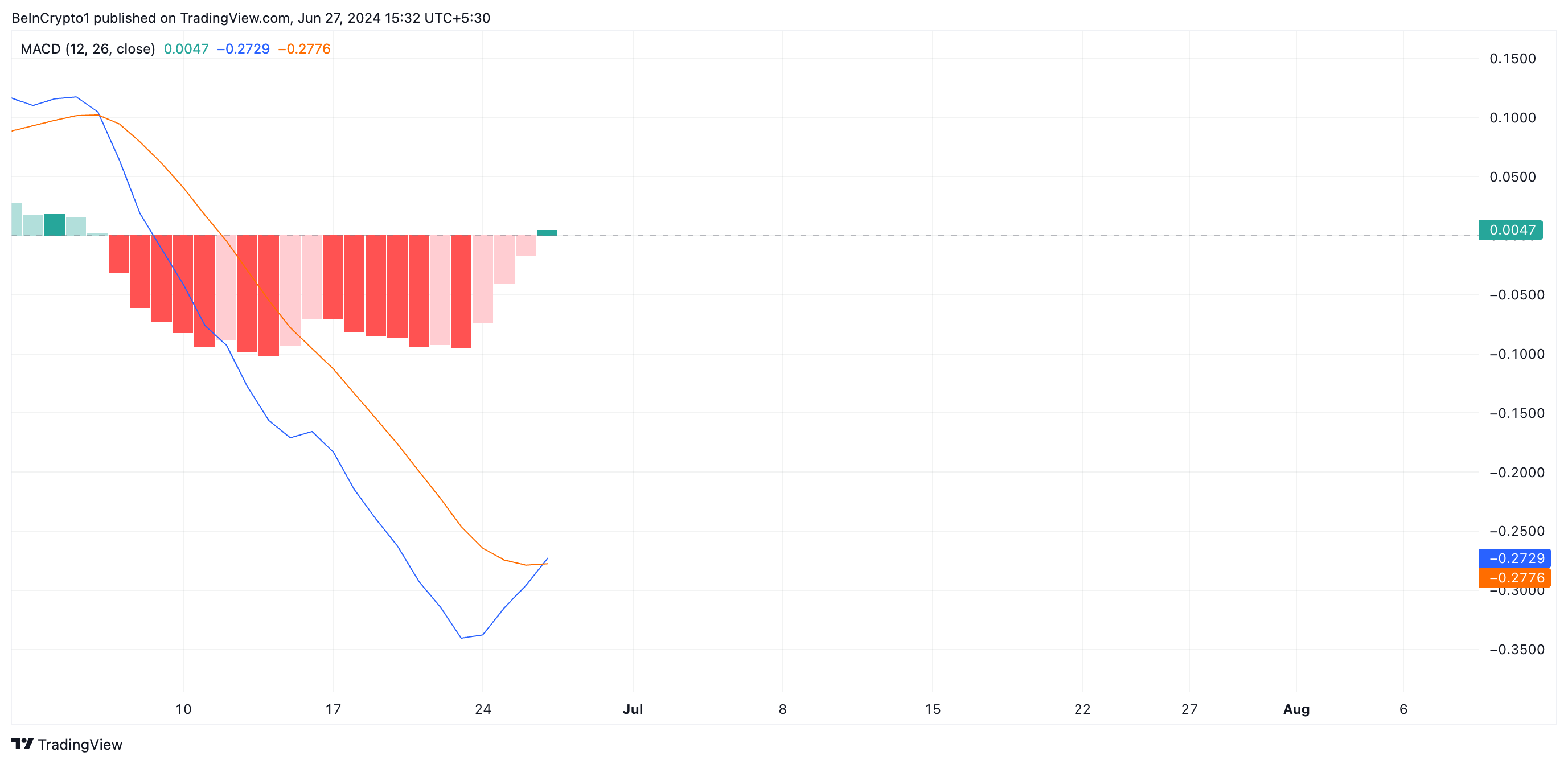 وفقًا لما هو مكتوب، تظهر قراءات من مؤشر تقارب/تباعد المتوسطات المتحركة (MACD) لـ WIF أن خط MACD (الأزرق) مستعد للتقاطع فوق خط الإشارة (البرتقالي).