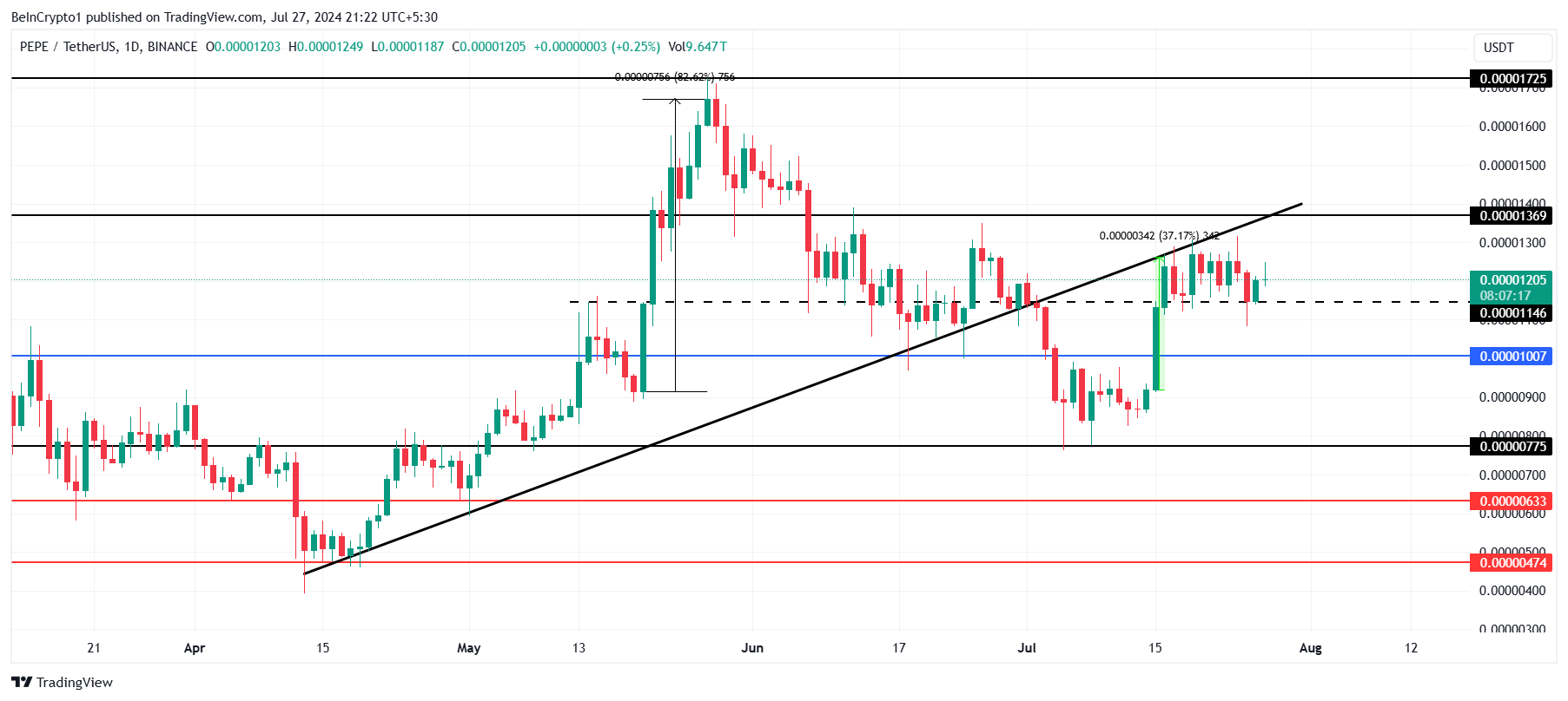 ومع ذلك، في حالة تجاوز البيع للتوقعات، من المحتمل جدًا أن ينخفض السعر إلى ما دون $0,00001146. هذا سيؤدي إلى انخفاض سعر PEPE إلى $0,00001007، مما يبطل الفرضية المحايدة ويمدد الخسائر.