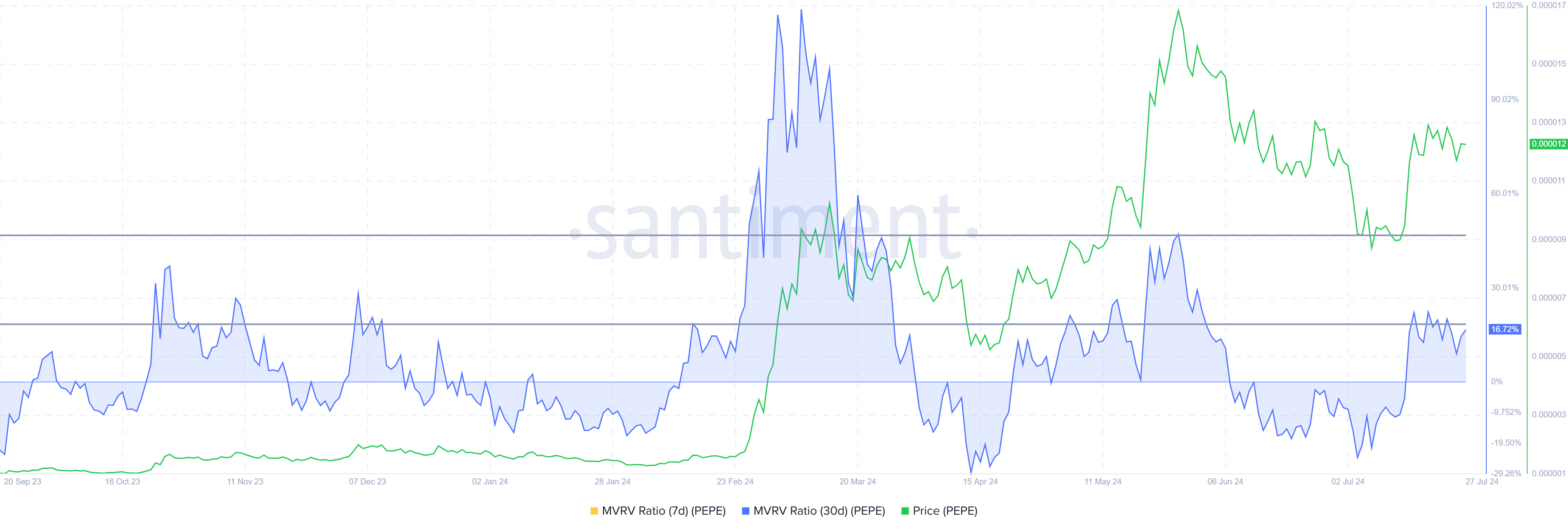 حاليًا، MVRV لمدة 30 يومًا لـ PEPE تقف عند 15%، مما يشير إلى الربحية وضغط البيع المحتمل. تاريخيًا، يميل PEPE إلى التصحيح عندما تكون نسبة MVRV بين 18% و48%، والتي غالبًا ما تسمى بمنطقة الخطر.