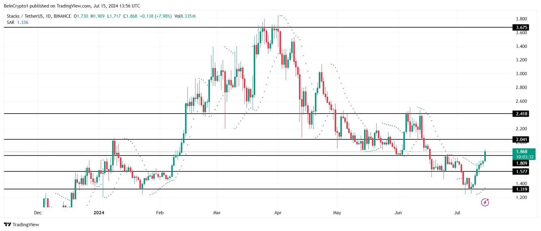 ارتفع سعر STX، الذي يتم تداوله عند 1.86 دولار في وقت كتابة هذا التقرير، بما يقرب من 8٪ خلال ال 24 ساعة الماضية. يقترب البديل من اختراق المقاومة عند 2.00 دولار ، وهو أمر ممكن إذا تم تعزيز دعم 1.80 دولار كأرضية دعم.